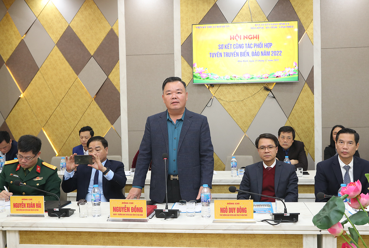 Tham dự hội nghị có các đồng chí: Nguyễn Đồng, Ủy viên Ban Thường vụ, Trưởng ban Tuyên giáo Tỉnh ủy Hòa Bình; Chuẩn Đô đốc Phạm Văn Luyện, Phó Chủ nhiệm Chính trị Hải quân; Ngô Duy Đông, Phó Trưởng ban Tuyên giáo Tỉnh ủy Vĩnh Phúc; Nguyễn Xuân Hải, Phó Trưởng ban Tuyên giáo Tỉnh ủy Hà Tĩnh; đại biểu cơ quan chuyên môn Ban Tuyên giáo 3 tỉnh và Viện Kỹ thuật.