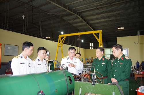 Thủ trưởng Tổng cục Công nghiệp Quốc phòng kiểm tra việc thực hiện đề tài "Nghiên cứu, thiết kế, chế tạo ngư lôi kiểu 53VA bắn tập" ở Viện Kỹ thuật Hải quân. Ảnh: PV