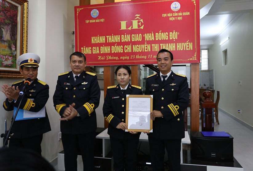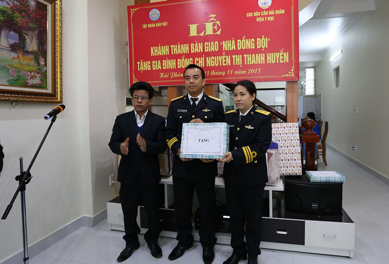 Tại lễ khánh thành và bàn giao nhà, Cục Hậu cần Hải quân, Viện Y học, Tập đoàn Bảo Việt, đại diện chính quyền địa phương và bà con nhân dân đã trao tặng gia đình đồng chí Huyền một số phần quà thiết yếu trong sinh hoạt.