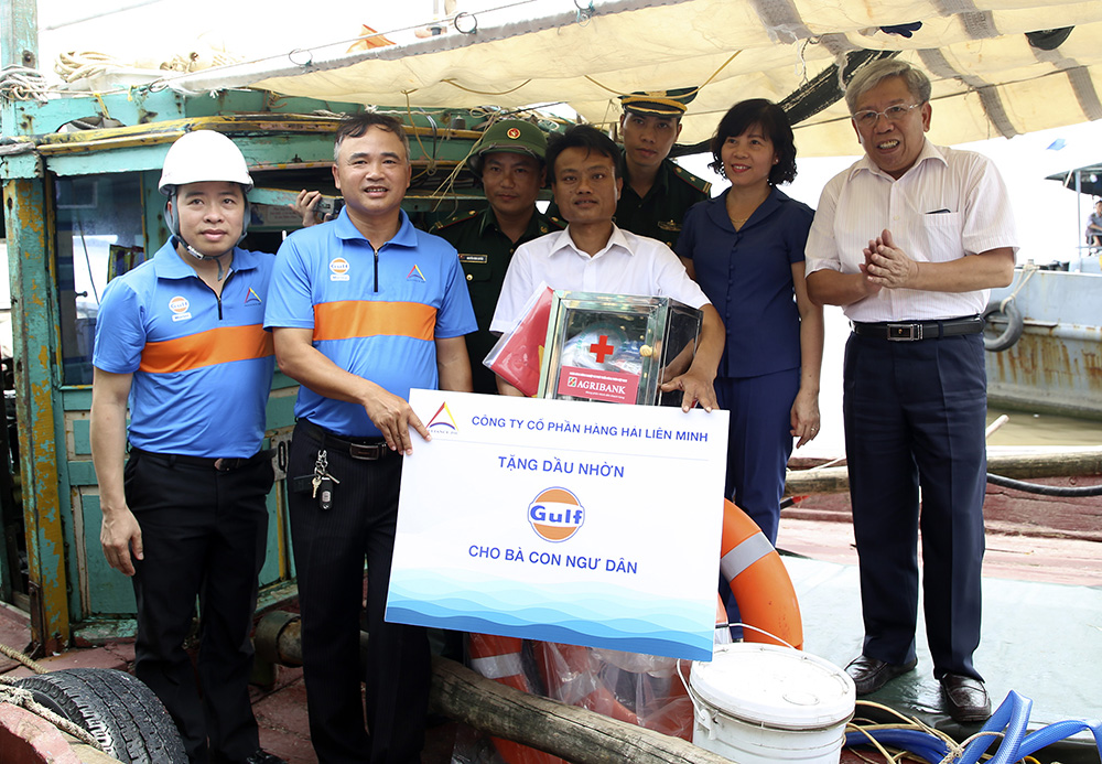 Ngay trong buổi lễ, Vùng 1 Hải quân, địa phương và các doanh nghiệp trao 150 phần quà thiết thực giúp ngư dân vươn khơi, bám biển dài ngày.
