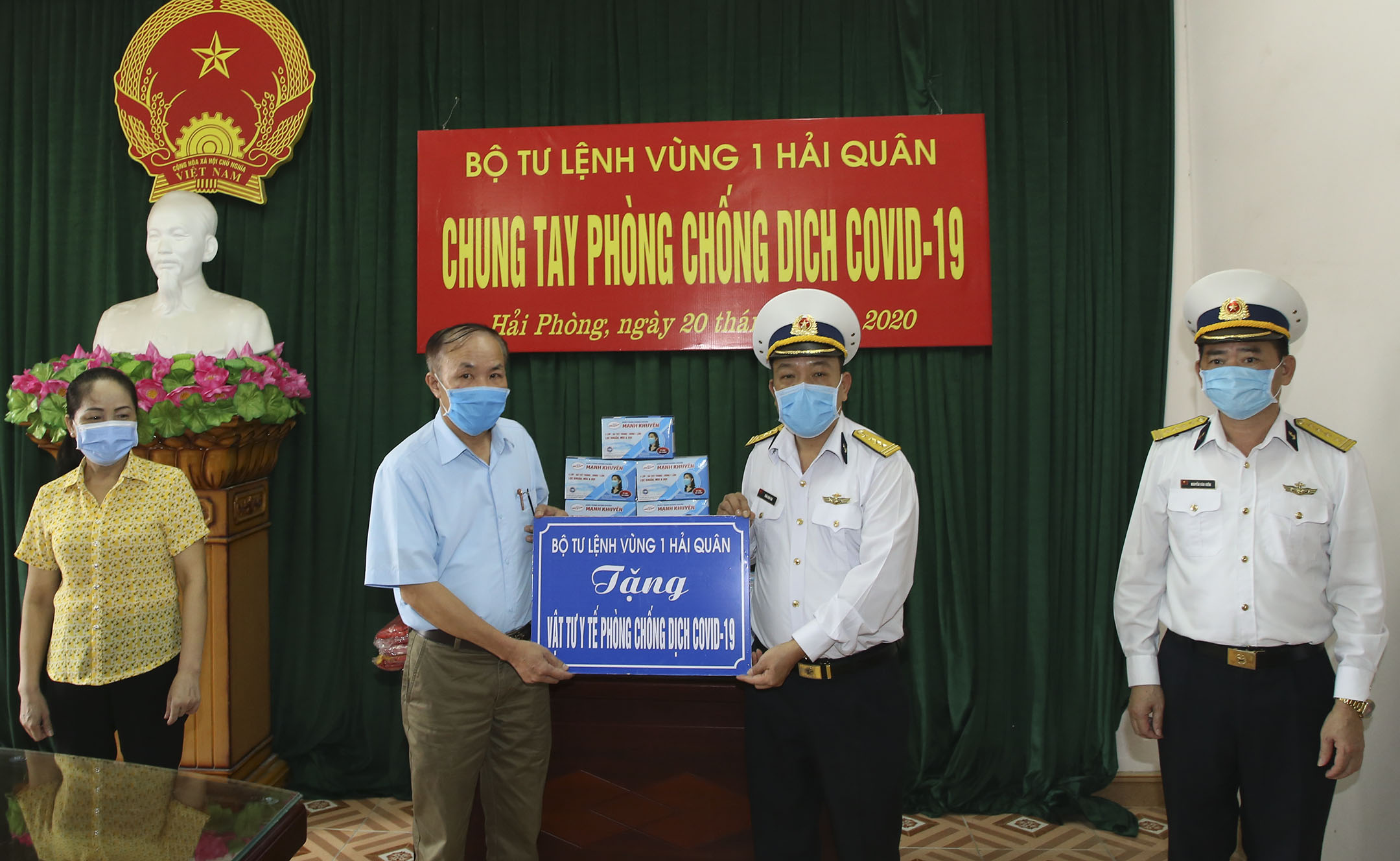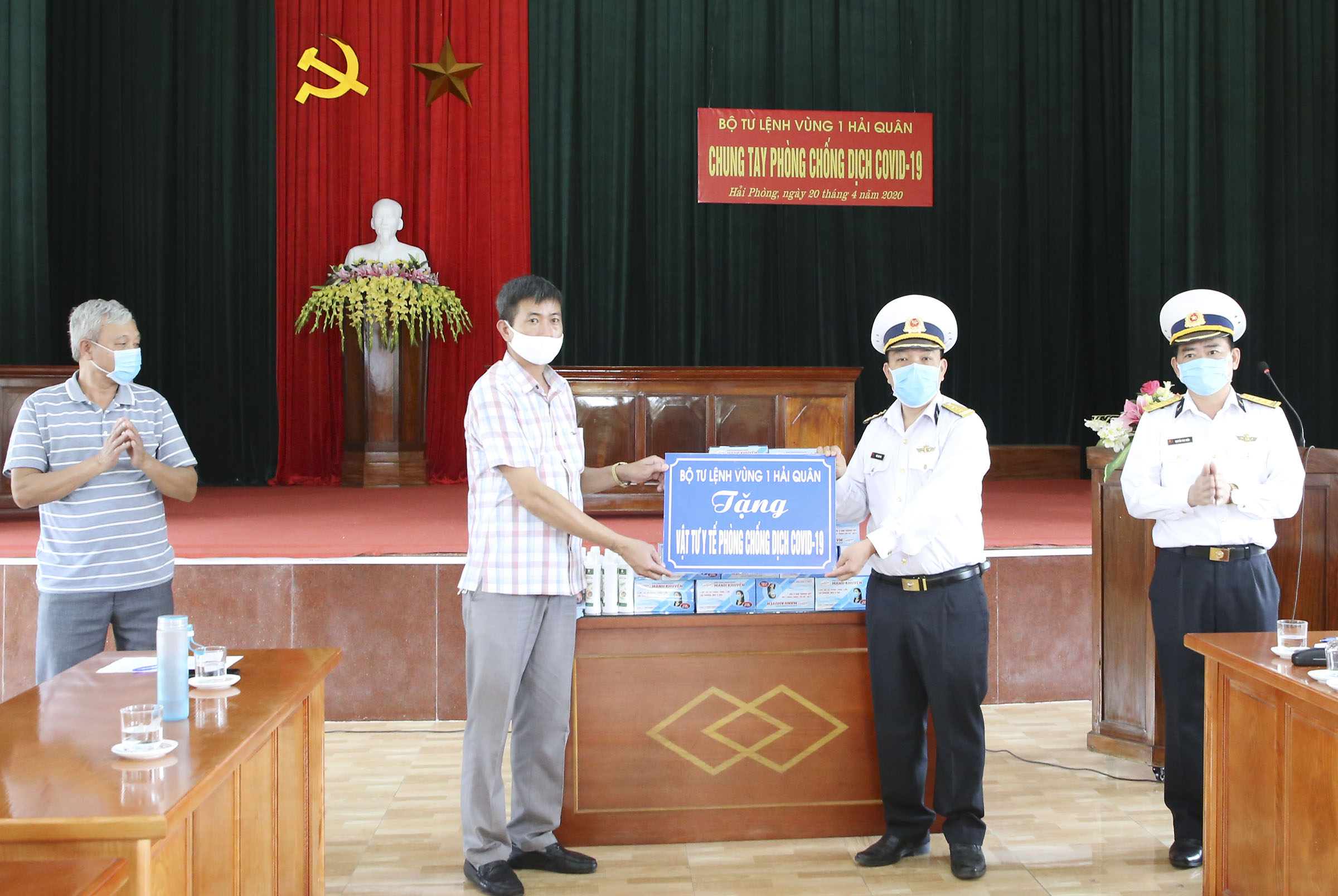 Tại cảng cá Mắt Rồng, UBND xã Lập Lễ và UBND xã Phả Lễ, huyện Thủy Nguyên, TP. Hải Phòng, Bộ Tư lệnh Vùng 1 Hải quân đã trao tặng 100 lá cờ Tổ quốc, 5.000 khẩu trang, 60 lọ nước sát khuẩn và 1.000 tờ rơi tuyên truyền phòng, chống dịch Covid-19 cho bà con ngư dân.