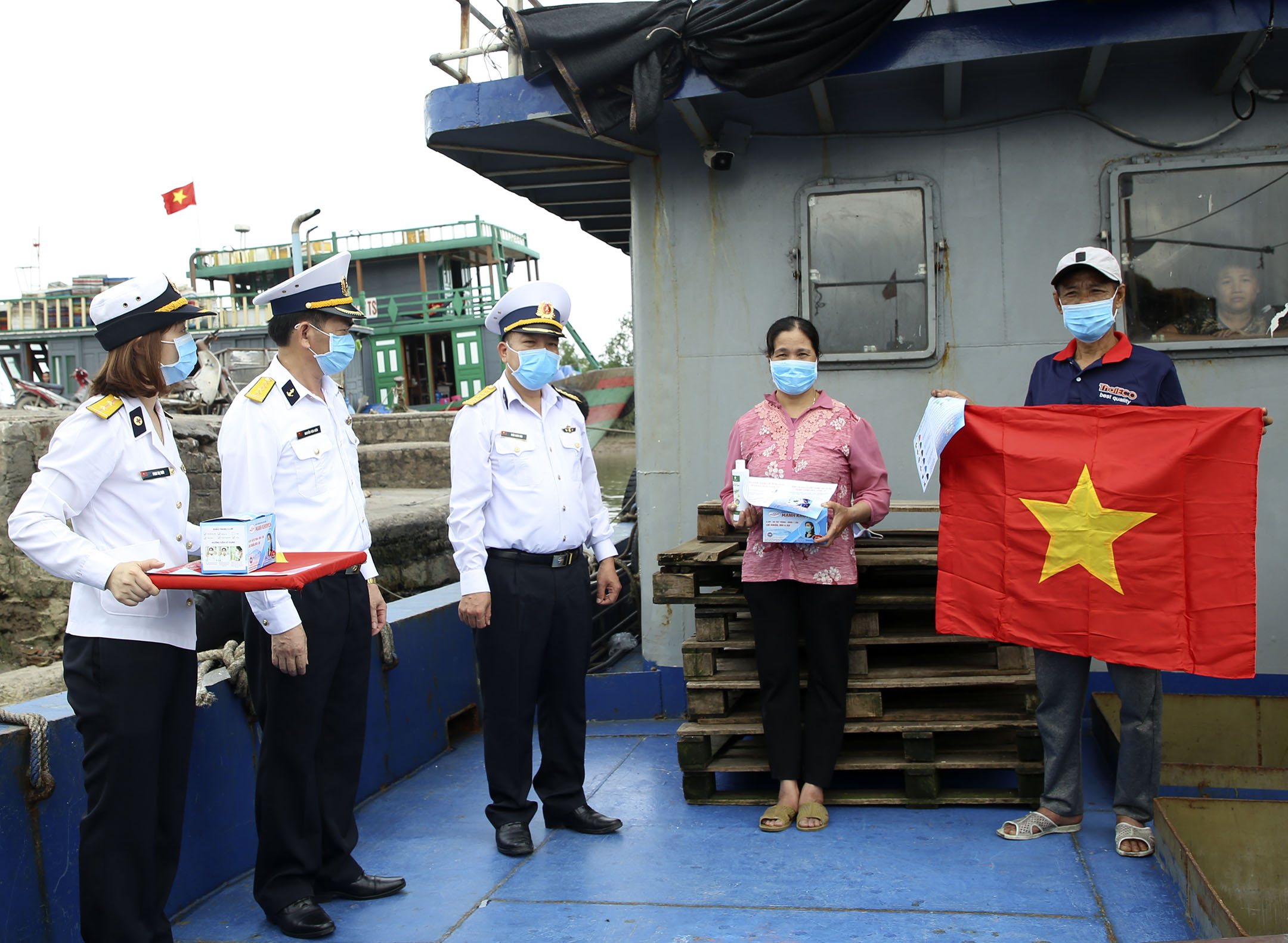 Đoàn cán bộ Vùng 1 Hải quân trao cờ Tổ quốc, khẩu trang và nước rửa tay sát khuẩn cho chủ tàu tại cảng cá Mắt Rồng, huyện Thủy Nguyên, TP. Hải Phòng