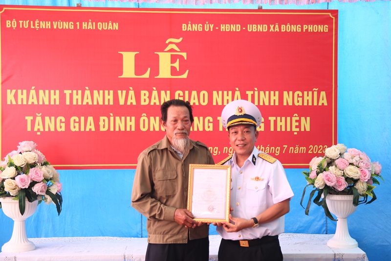 Chiều 12/7, tại xã Đông Phong, huyện Tiền Hải, tỉnh Thái Bình, Bộ Tư lệnh Vùng 1 Hải quân phối hợp với chính quyền địa phương tổ chức khánh thành và bàn giao nhà tình nghĩa cho gia đình ông Đặng Trung Thiện.
