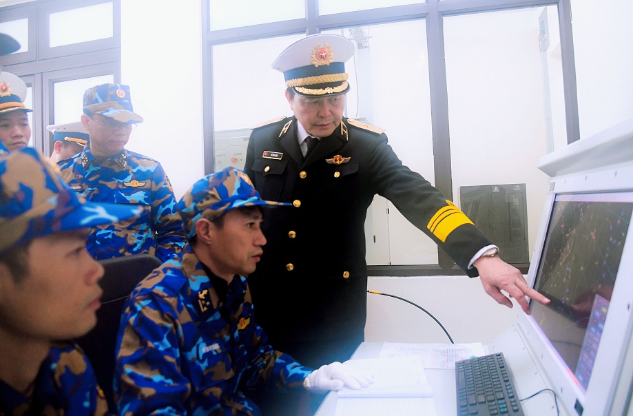 Chuẩn Đô đốc Vũ Văn Nam kiểm tra kíp trực của Trạm ra đa 480