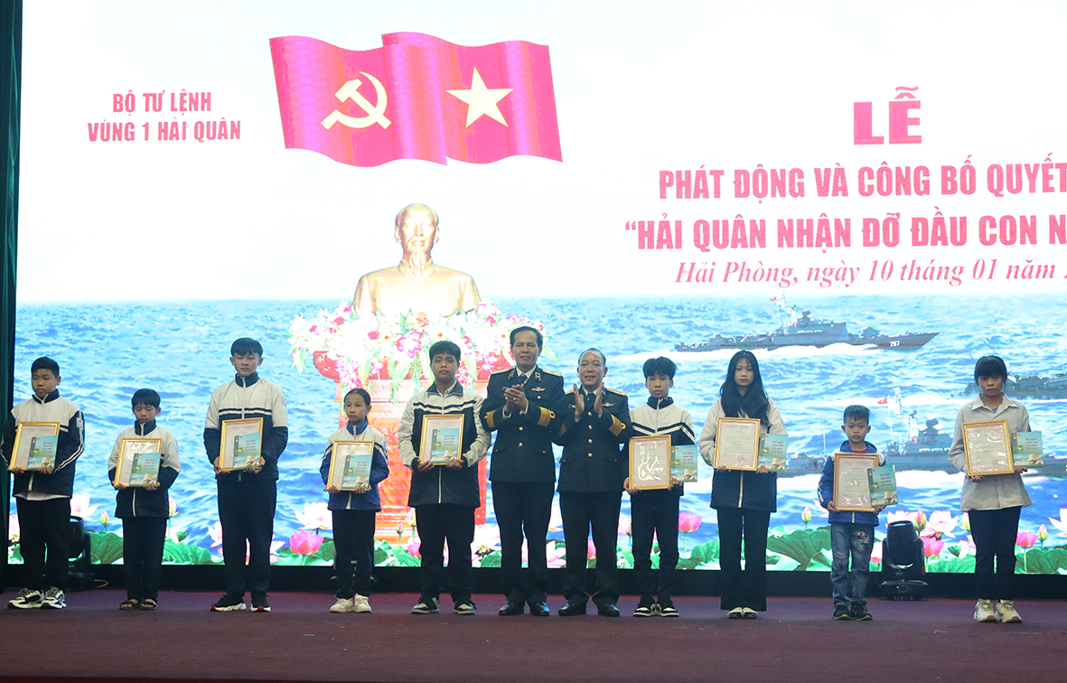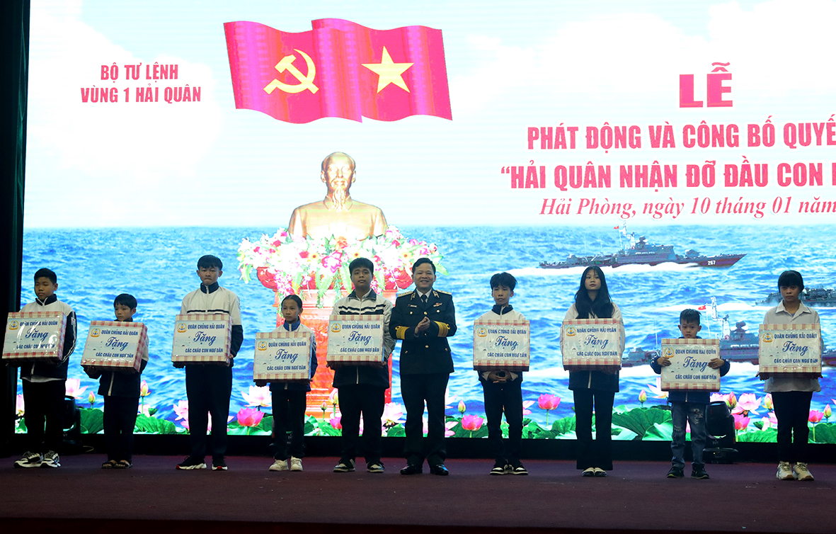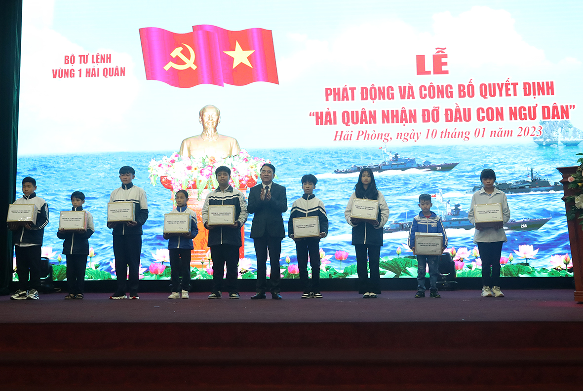 Tại buổi lễ, thủ trưởng Bộ Tư lệnh Vùng 1 đã trao quyết định nhận đỡ đầu 9 cháu thuộc 6 hộ gia đình ngư dân có hoàn cảnh khó khăn đang sinh sống tại 3 quận, huyện ven biển TP. Hải Phòng.