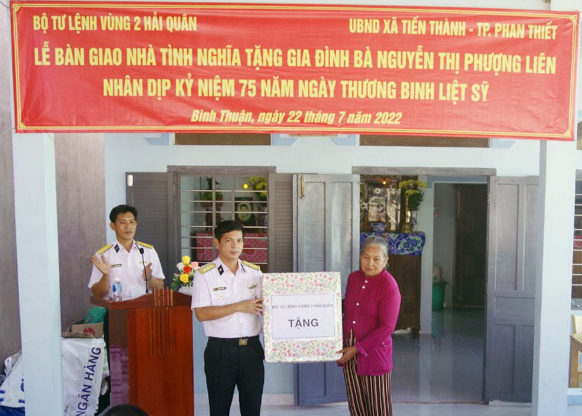 Sáng 22/7, tại thôn Tiến An, xã Tiến Thành, TP. Phan Thiết, tỉnh Bình Thuận, thừa ủy quyền của thủ trưởng Bộ Tư lệnh Vùng 2, Lữ đoàn 681 phối hợp với Đảng ủy, UBND, UBMTTQ Việt Nam xã Tiến Thành tổ chức bàn giao nhà tình nghĩa cho gia đình bà Nguyễn Thị Phượng Liên.