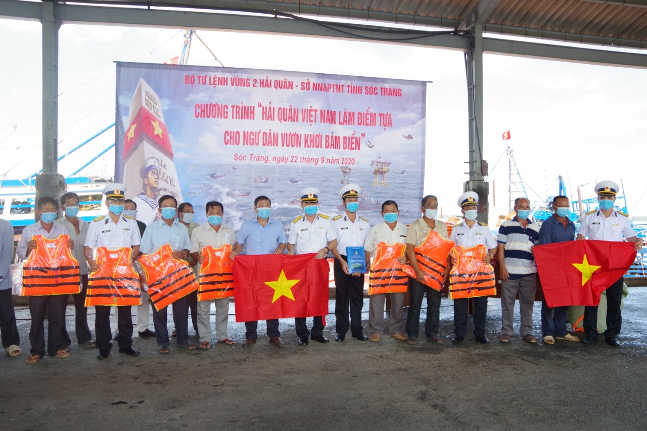 Các đại biểu Vùng 2 Hải quân và Sở Nông nghiệp và Phát triển nông thôn tỉnh Sóc Trăng tặng cờ Tổ quốc, áo phao cho ngư dân. Ảnh: Trung Hiếu