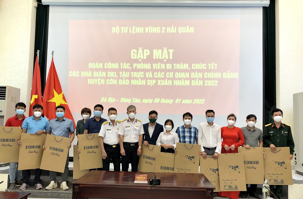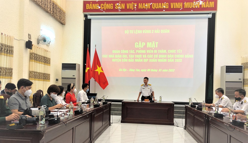 Chiều 6/1, tại Lữ đoàn 171 (TP. Vũng Tàu, tỉnh Bà Rịa-Vũng Tàu) Bộ Tư lệnh Vùng 2 Hải quân tổ chức gặp mặt đoàn công tác tham gia chuyến thăm, chúc tết cán bộ, chiến sĩ Nhà giàn DK1 và tàu trực trên biển; đảng bộ, chính quyền, lực lượng vũ trang, nhân dân huyện Côn Đảo nhân dịp Tết Nhâm Dần 2022.