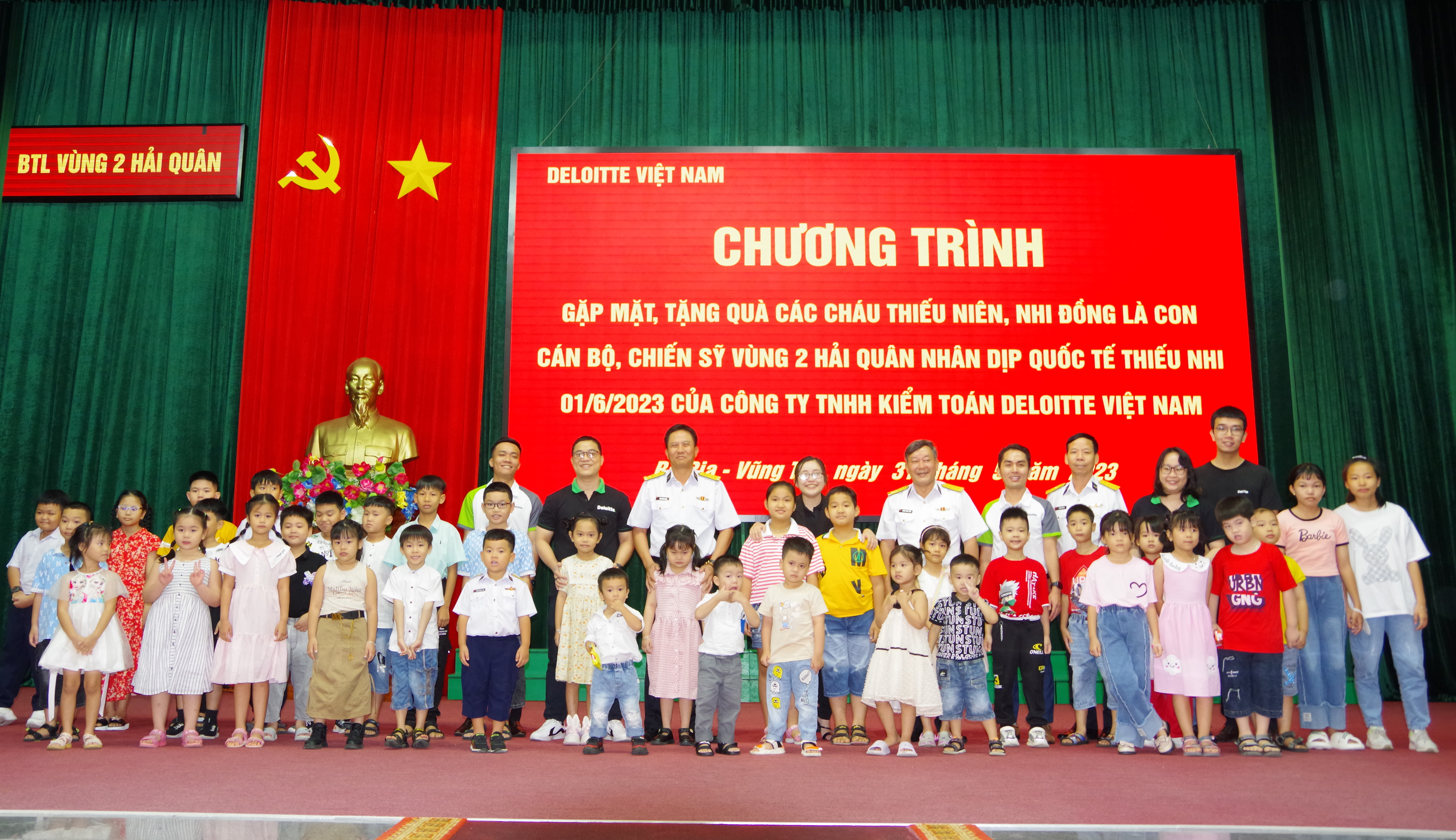 Ngày 31/5, tại TP. Vũng Tàu, tỉnh Bà Rịa-Vũng Tàu, Bộ Tư lệnh Vùng 2 Hải quân phối hợp với Công ty TNHH Kiểm toán Deloitte Việt Nam tổ chức chương trình gặp mặt, tặng quà các cháu là con của cán bộ, nhân viên đang công tác tại Vùng 2 nhân dịp Quốc tế thiếu nhi 1/6 và kết thúc năm học 2022–2023.