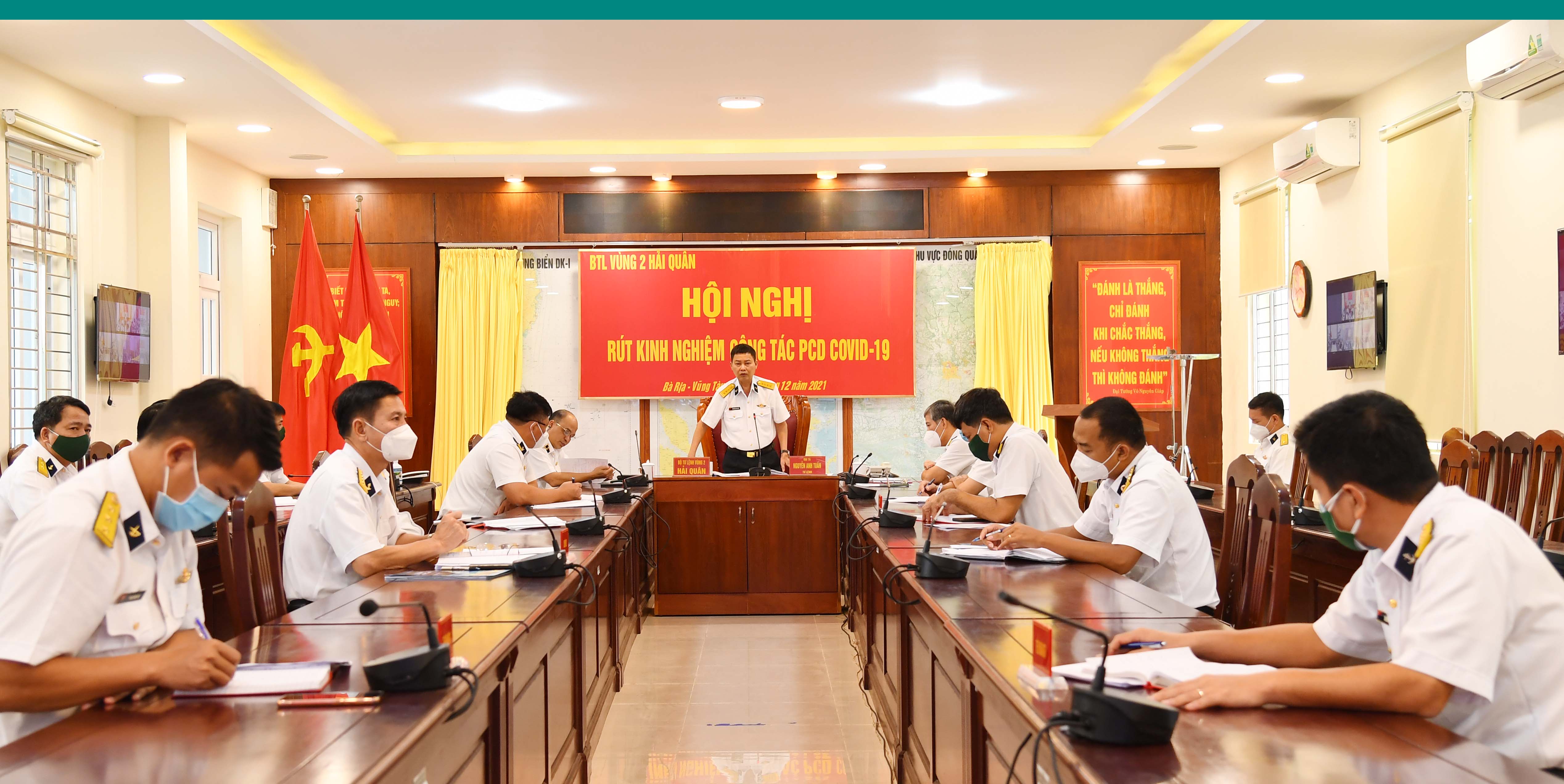 Chiều 15/12, tại TP. Vũng Tàu, tỉnh Bà Rịa-Vũng Tàu, Vùng 2 Hải quân tổ chức Hội nghị rút kinh nghiệm công tác phòng, chống dịch (PCD) Covid-19 bằng hình thức trực tuyến tới 5 điểm cầu trong toàn Vùng.