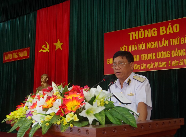 Sáng 30-5, tại Căn cứ Long Sơn, thành phố Vũng Tàu, Đảng ủy Vùng 2 Hải quân đã tổ chức thông báo kết quả Hội nghị lần thứ 7, Ban Chấp hành Trung ương Khóa XII. Chuẩn Đô đốc Nguyễn Phong Cảnh, Bí thư Đảng ủy, Chính ủy Vùng 2 chủ trì hội nghị. Có hơn 380 đồng chí là cán bộ, đảng viên của các đơn vị trong Vùng tham dự.