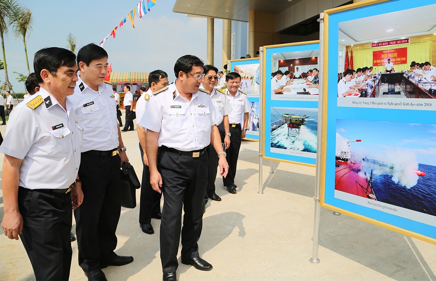 Chuẩn Đô đốc Phạm Hoài Nam cùng các đại biểu tham quan khu trưng bày bảng ảnh hoạt động của đơn vị