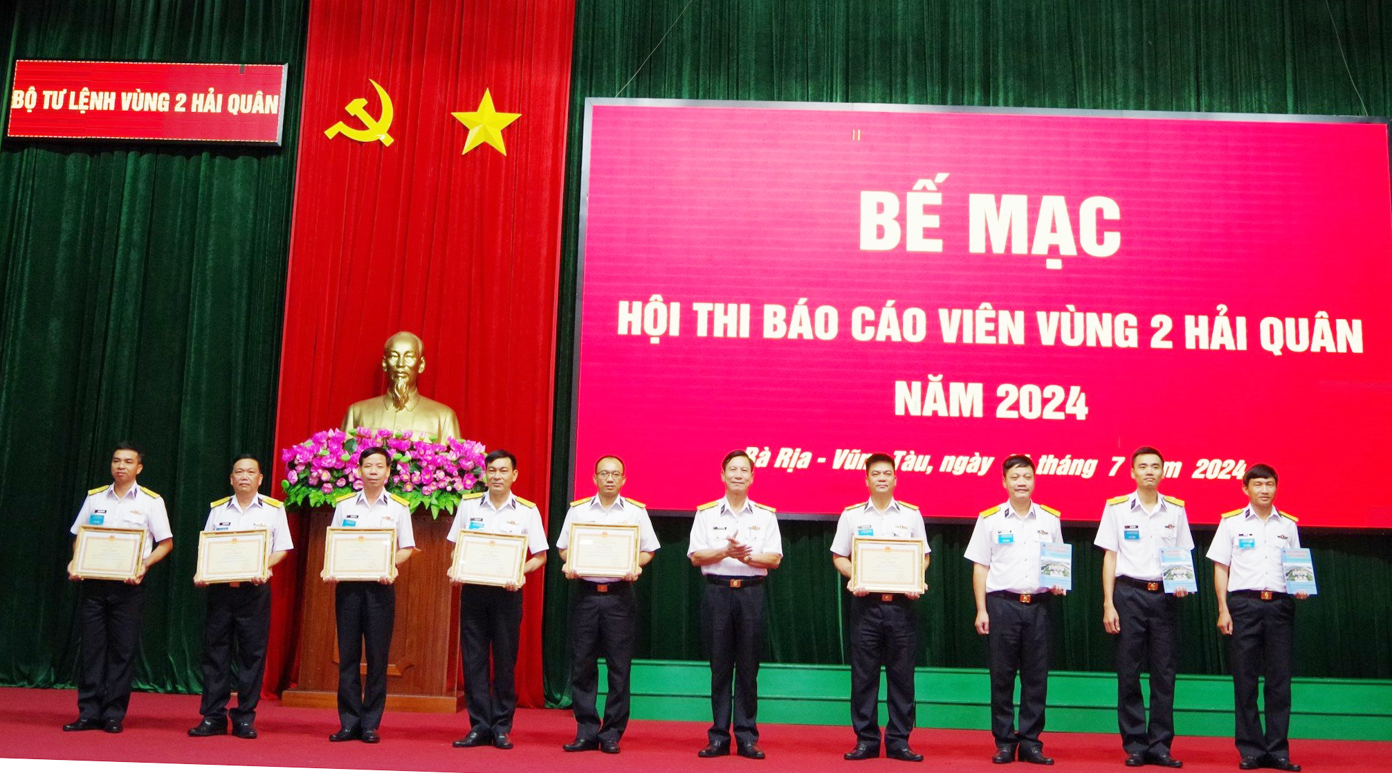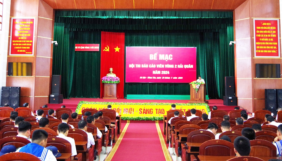 Chiều 24/7, tại TP. Vũng Tàu, tỉnh Bà Rịa – Vũng Tàu, Bộ Tư lệnh Vùng 2 Hải quân tổ chức Bế mạc Hội thi Báo cáo viên năm 2024. Đại tá Đỗ Hồng Duyên, Phó Chính uỷ Vùng, Trưởng ban tổ chức hội thi dự và chỉ đạo. Dự bế mạc có các đồng chí trong Ban tổ chức, Ban giám khảo; lãnh đạo, chỉ huy cơ quan, đơn vị và 46 thí sinh tham gia hội thi.