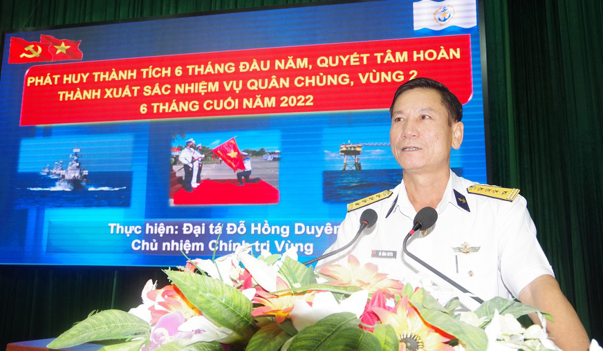 Quán triệt và triển khai nhiệm vụ 6 tháng cuối năm 2022, Đại tá Đỗ Hồng Duyên yêu cầu: Cấp ủy, chỉ huy các cấp phát huy kết quả thực hiện nhiệm vụ 6 tháng đầu năm; tiếp tục quán triệt, nắm chắc phương hướng, nhiệm vụ 6 tháng cuối năm 2022 của Quân chủng và Vùng; xây dựng ý chí quyết tâm, tinh thần trách nhiệm, đoàn kết, chủ động khắc phục khó khăn, hoàn thành xuất sắc nhiệm vụ năm 2022, góp phần xây dựng Quân chủng, Vùng cách mạng, chính quy, tinh nhuệ, hiện đại, bảo vệ vững chắc chủ quyền biển, đảo Tổ quốc.