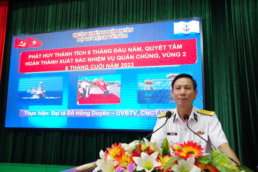 Ngày 25 và 26/7, tại các tỉnh Bà Rịa-Vũng Tàu, Bình Thuận, Đồng Nai và TP. Hồ Chí Minh, Đảng ủy, Bộ Tư lệnh Vùng 2 Hải quân và cấp ủy các đơn vị trực thuộc Vùng tổ chức Hội nghị quán triệt nhiệm vụ 6 tháng cuối năm 2023 của Quân chủng Hải quân, Vùng 2 và bài phát biểu của đồng chí Tổng Bí thư Nguyễn Phú Trọng tại Hội nghị Quân ủy Trung ương lần thứ 6, nhiệm kỳ 2020-2025.