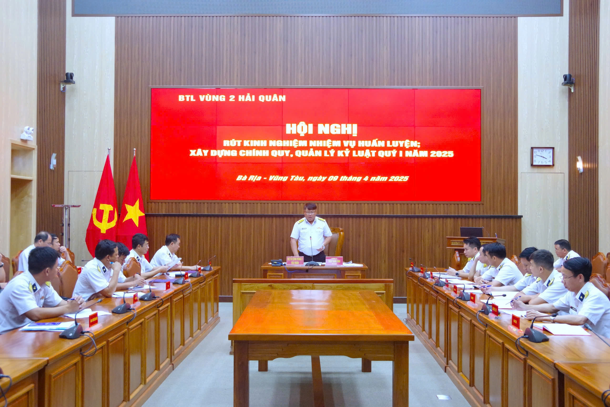 Chiều 9/4, tại TP Vũng Tàu, tỉnh Bà Rịa - Vũng Tàu, Vùng 2 tổ chức Hội nghị rút kinh nghiệm nhiệm vụ huấn luyện; xây dựng chính quy, quản lý kỷ luật Quý I năm 2025 bằng hình thức trực tiếp và trực tuyến các điểm cầu trong toàn Vùng. Thượng tá Triệu Thanh Tùng, Phó Tư lệnh Vùng chủ trì.