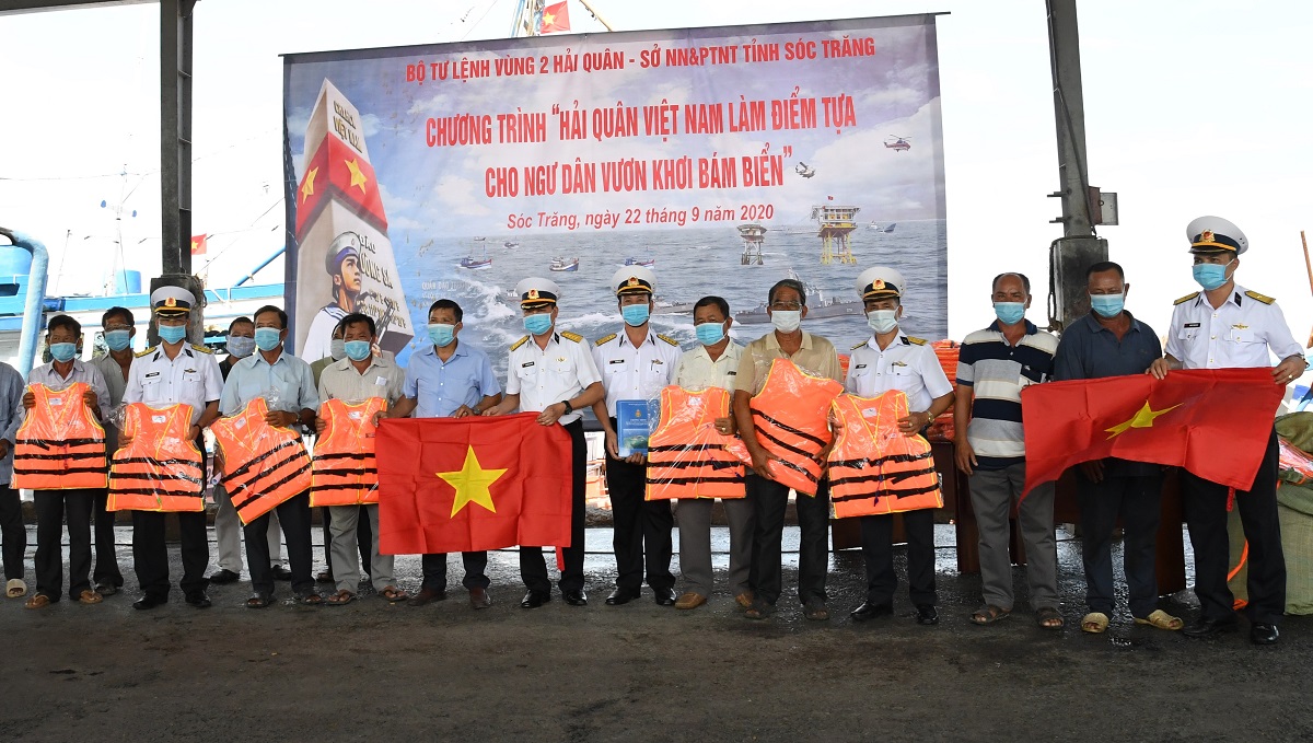 Thủ trưởng Bộ Tư lệnh Vùng 2 tặng áo phao, cờ Tổ quốc cho đại diện ngư dân tại cảng cá Trần Đề, tỉnh Sóc Trăng
