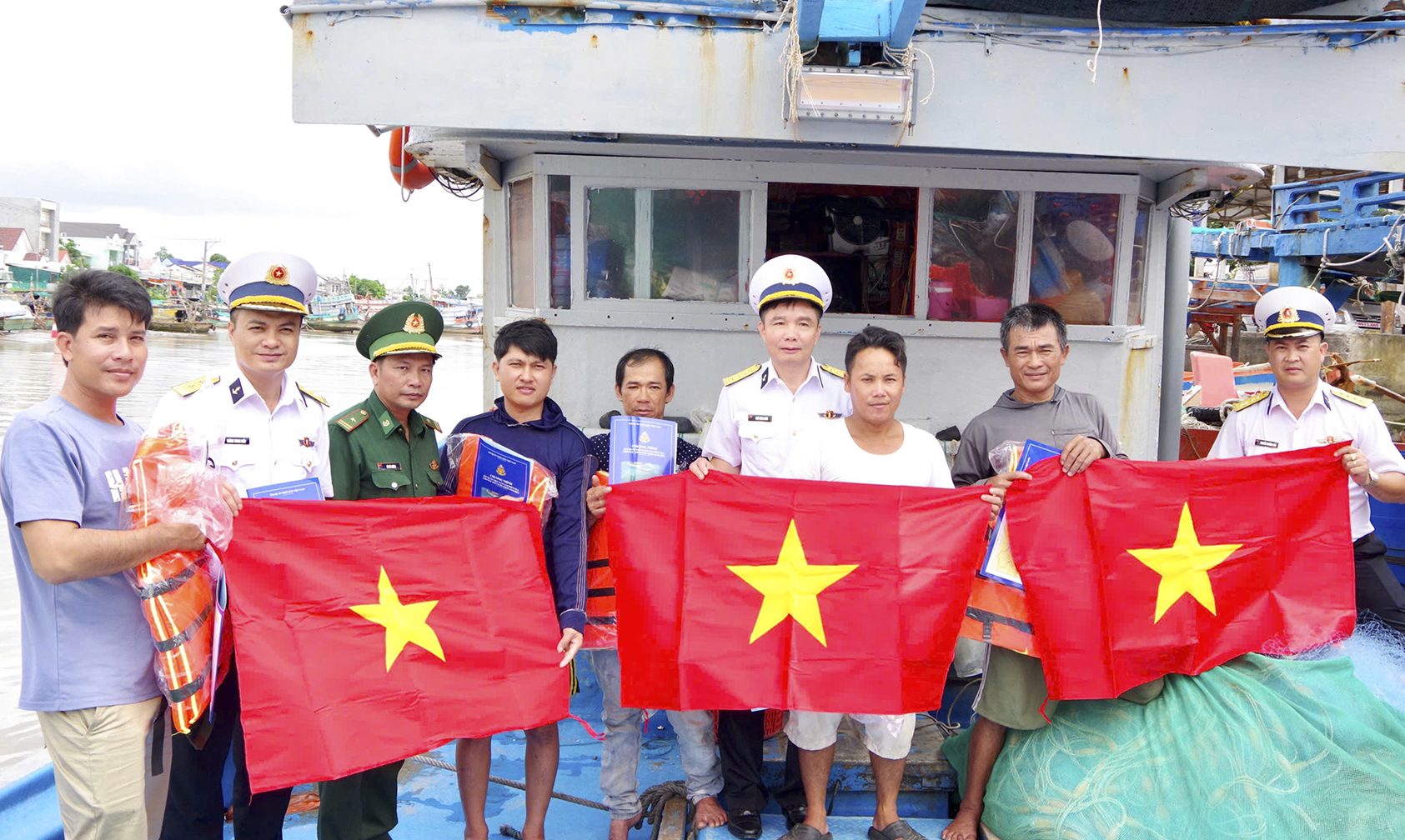 Cán bộ Vùng 2 trao cờ Tổ quốc, áo phao và quà tặng các ngư dân tại cảng cá Định An