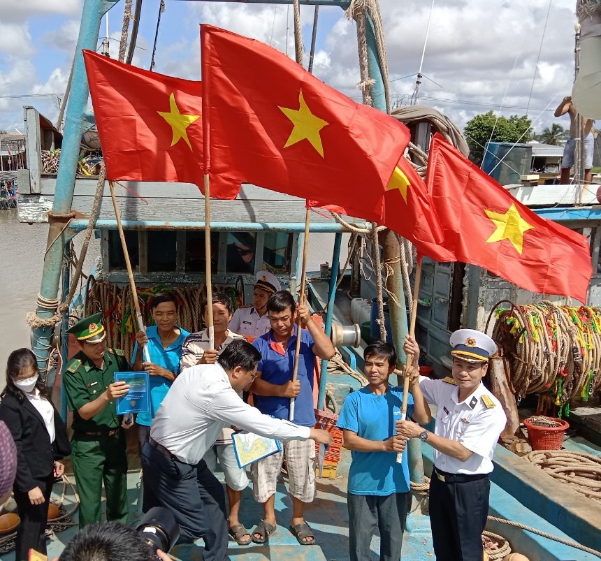 Trao tặng cờ Tổ quốc và phát tài liệu tuyên truyền cho tàu cá ngư dân trước giờ xuất bến