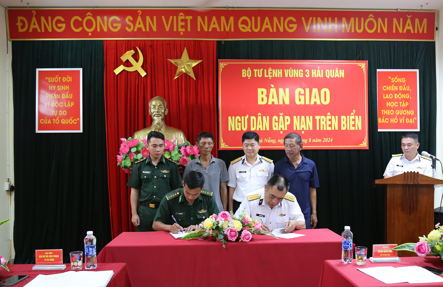 Sáng 25/8, tại Lữ đoàn 161 (phường Thọ Quang, quận Sơn Trà, TP. Đà Nẵng), Vùng 3 Hải quân tổ chức bàn giao hai ngư dân gặp nạn trên biển Hoàng Sa cho Đồn Biên phòng Sơn Trà thuộc Bộ Chỉ huy Bộ đội Biên phòng TP. Đà Nẵng. Đại tá Đoàn Bảo Anh, Phó Tư lệnh Vùng 3 chủ trì bàn giao.