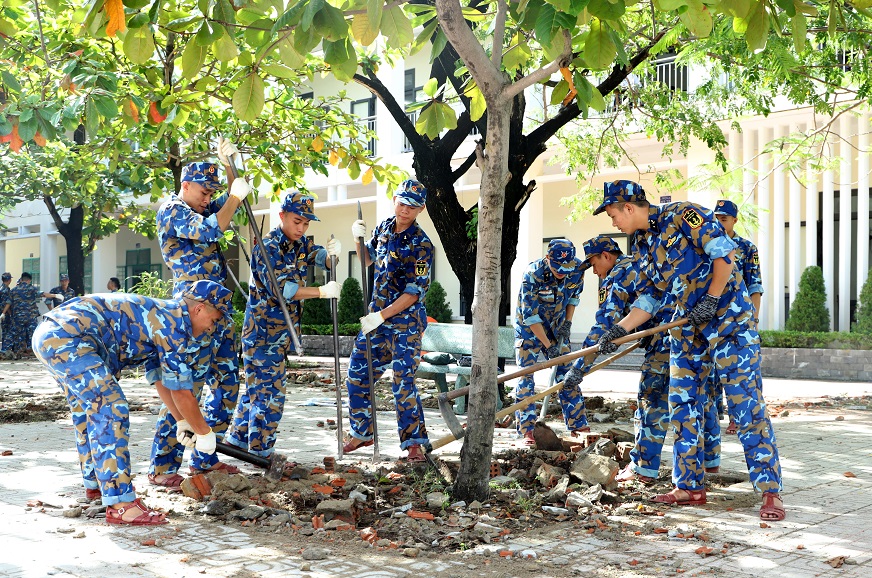 Các cán bộ, chiến sĩ tích cực lao động hỗ trợ nhà trường cải tạo khuôn viên
