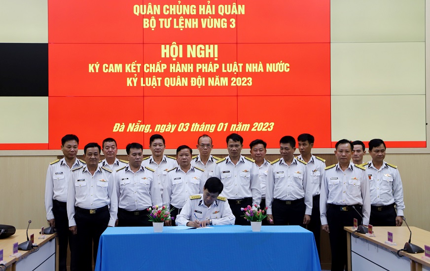 Sáng 3/1, tại Đà Nẵng, Bộ Tư lệnh Vùng 3 Hải quân tổ chức Hội nghị ký cam kết chấp hành pháp luật Nhà nước, kỷ luật Quân đội năm 2023. Đại tá Nguyễn Thiên Quân, Tư lệnh Vùng chủ trì. Cùng dự có Chuẩn Đô đốc Mai Trọng Định, Bí thư Đảng ủy, Chính ủy Vùng và lãnh đạo, chỉ huy các cơ quan, đơn vị.