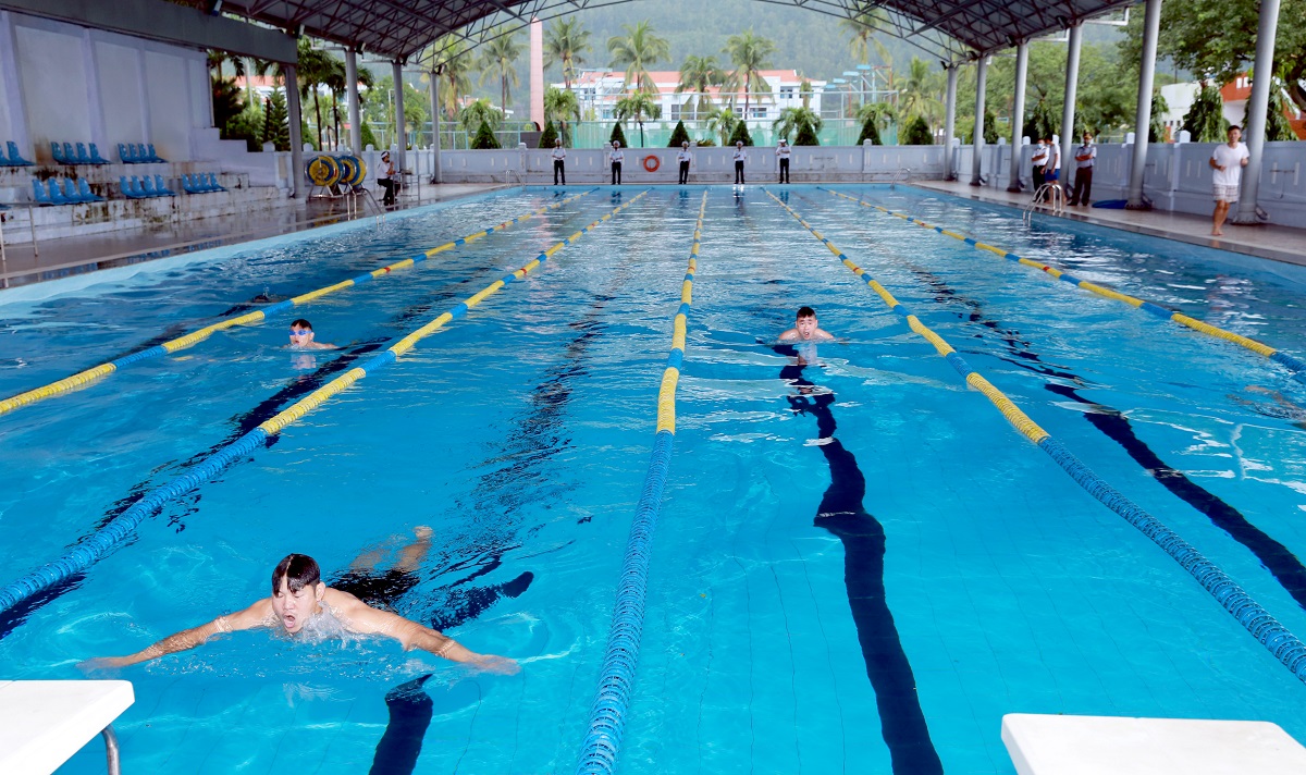 Sau khai mạc, các thí sinh tham gia thi môn bơi 250m và điều lệnh đội ngũ.