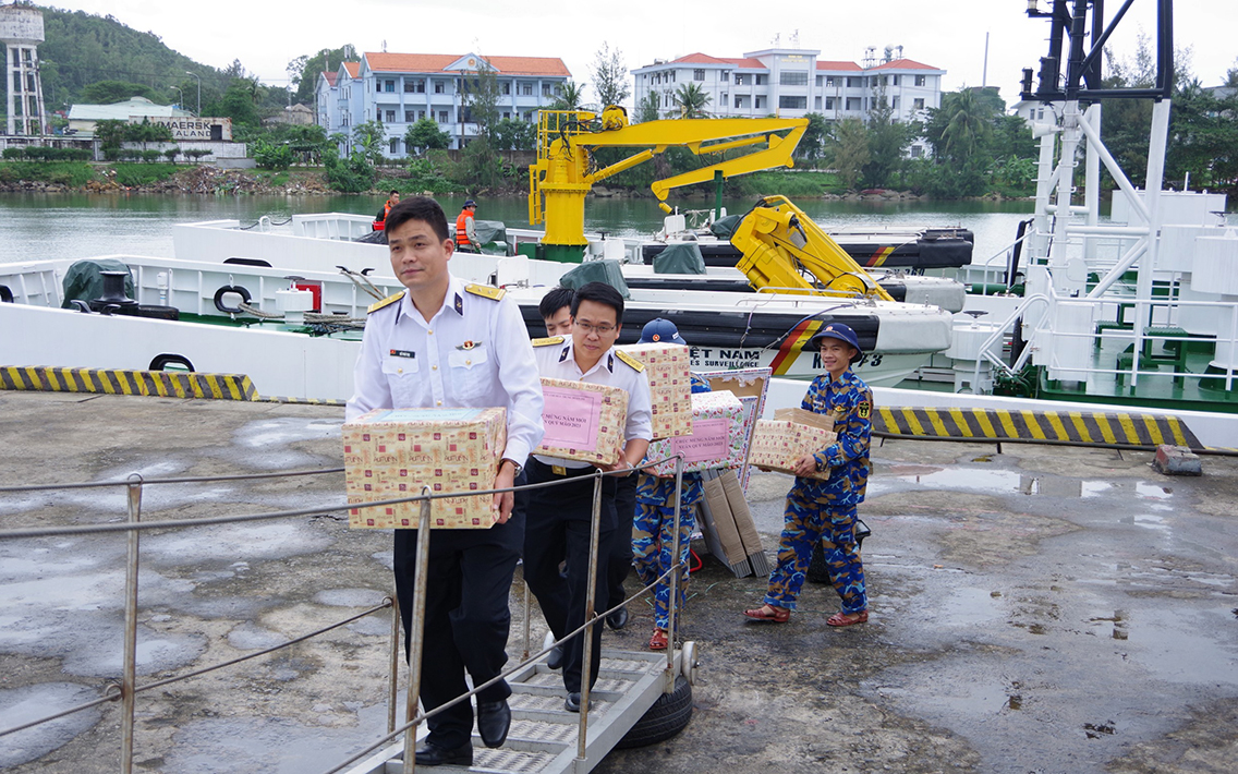 Cán bộ, chiến sĩ Vùng 3 vận chuyển hàng, quà lên tàu ra đảo