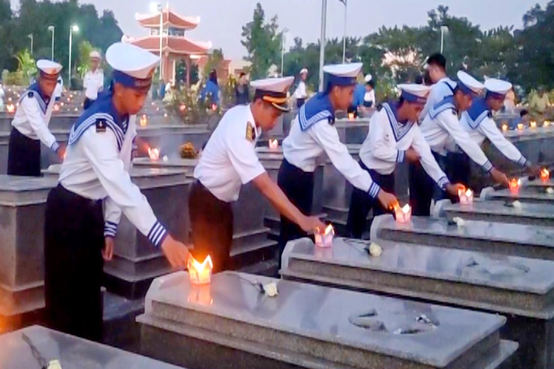 Các chiến sĩ Trung tâm Bảo đảm kỹ thuật Vùng 3 thắp nến tri ân tại nghĩa trang liệt sĩ thành phố Đà Nẵng