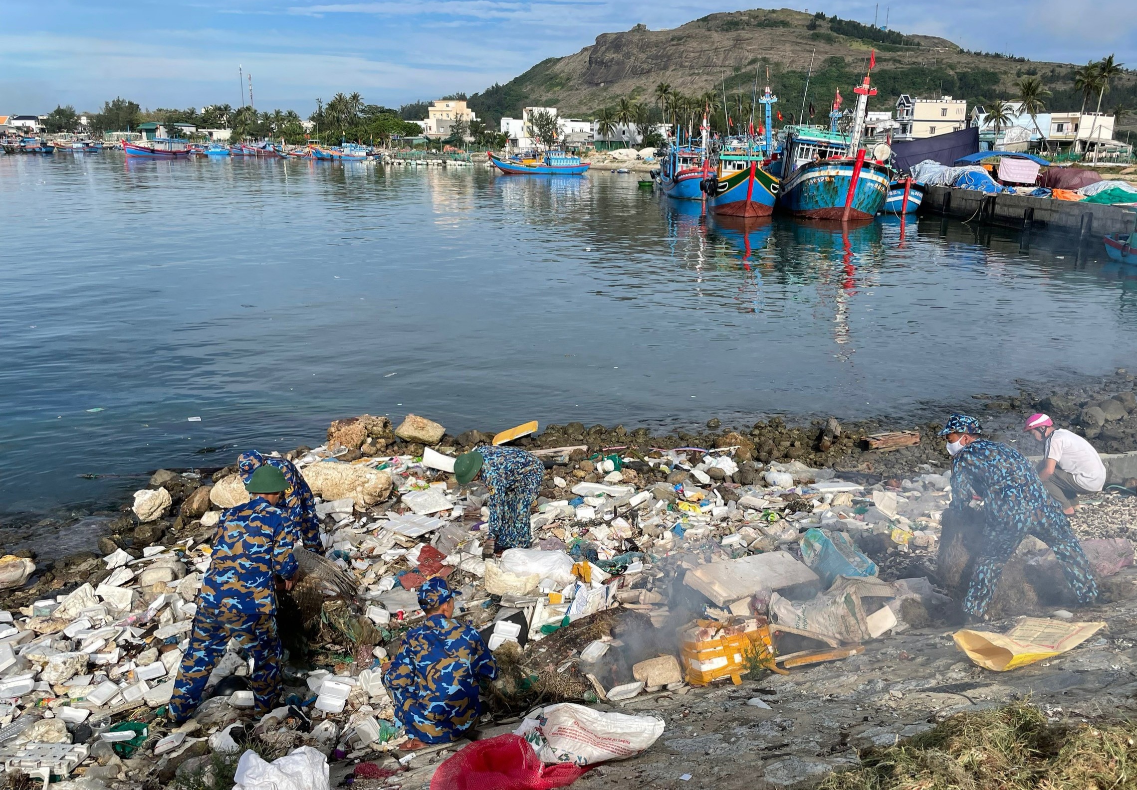 Cán bộ, đoàn viên thanh niên Trạm ra đa 550 (huyện đảo Lý Sơn) vệ sinh môi trường biển