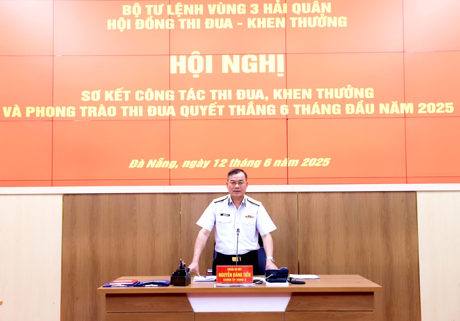 Chiều 12/6, tại Đà Nẵng, Hội đồng thi đua-khen thưởng (TĐ-KT) Vùng 3 Hải quân tổ chức Hội nghị sơ kết công tác TĐ-KT và phong trào thi đua quyết thắng (TĐQT) 6 tháng đầu năm 2025. Chuẩn Đô đốc Nguyễn Đăng Tiến, Bí thư Đảng ủy, Chính ủy, Chủ tịch Hội đồng TĐ-KT Vùng 3 chủ trì.