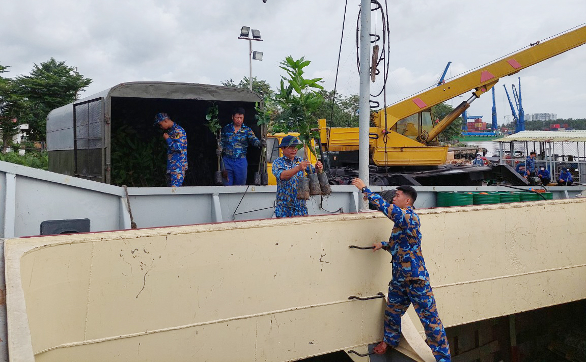 Cán bộ, chiến sĩ vận chuyển cây lên tàu