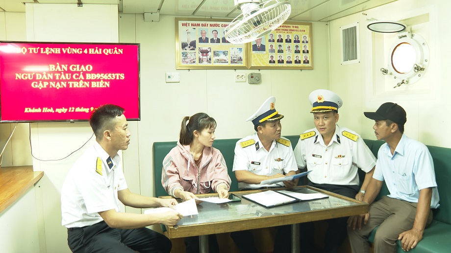 Chiều 12/9, tại TP. Cam Ranh, tỉnh Khánh Hòa, Vùng 4 Hải quân đã tiến hành bàn giao ngư dân bị viêm ruột thừa cấp trên tàu cá BĐ 95653 TS cho gia đình và chính quyền địa phương.