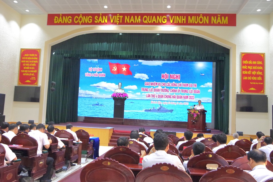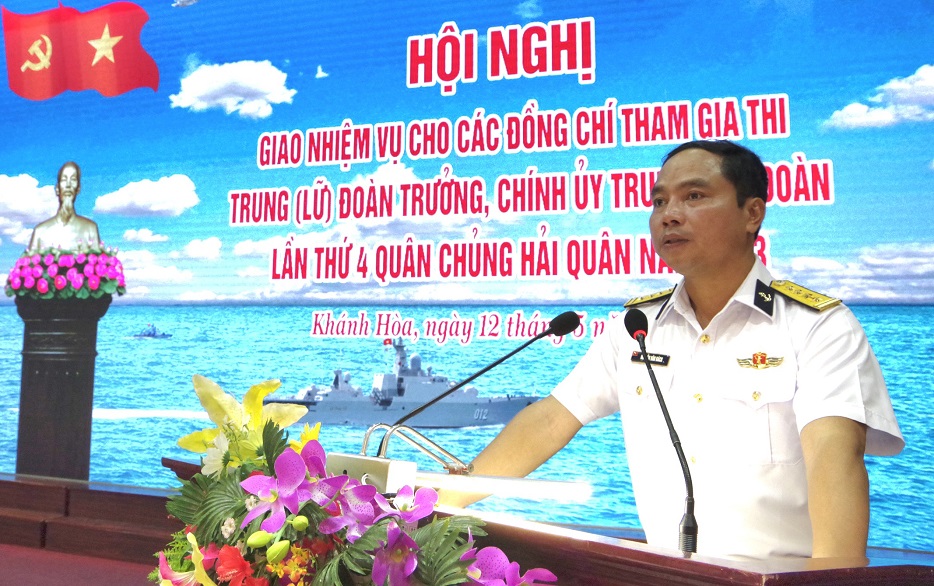 Sáng 12/5, tại TP. Cam Ranh, tỉnh Khánh Hòa, Bộ Tư lệnh Vùng 4 Hải quân tổ chức giao nhiệm vụ cho các đồng chí tham gia thi trung (lữ) đoàn trưởng, chính ủy trung (lữ) đoàn lần thứ 4, Quân chủng Hải quân năm 2023. Đại tá Nguyễn Văn Bách, Tư lệnh Vùng chủ trì giao nhiệm vụ.