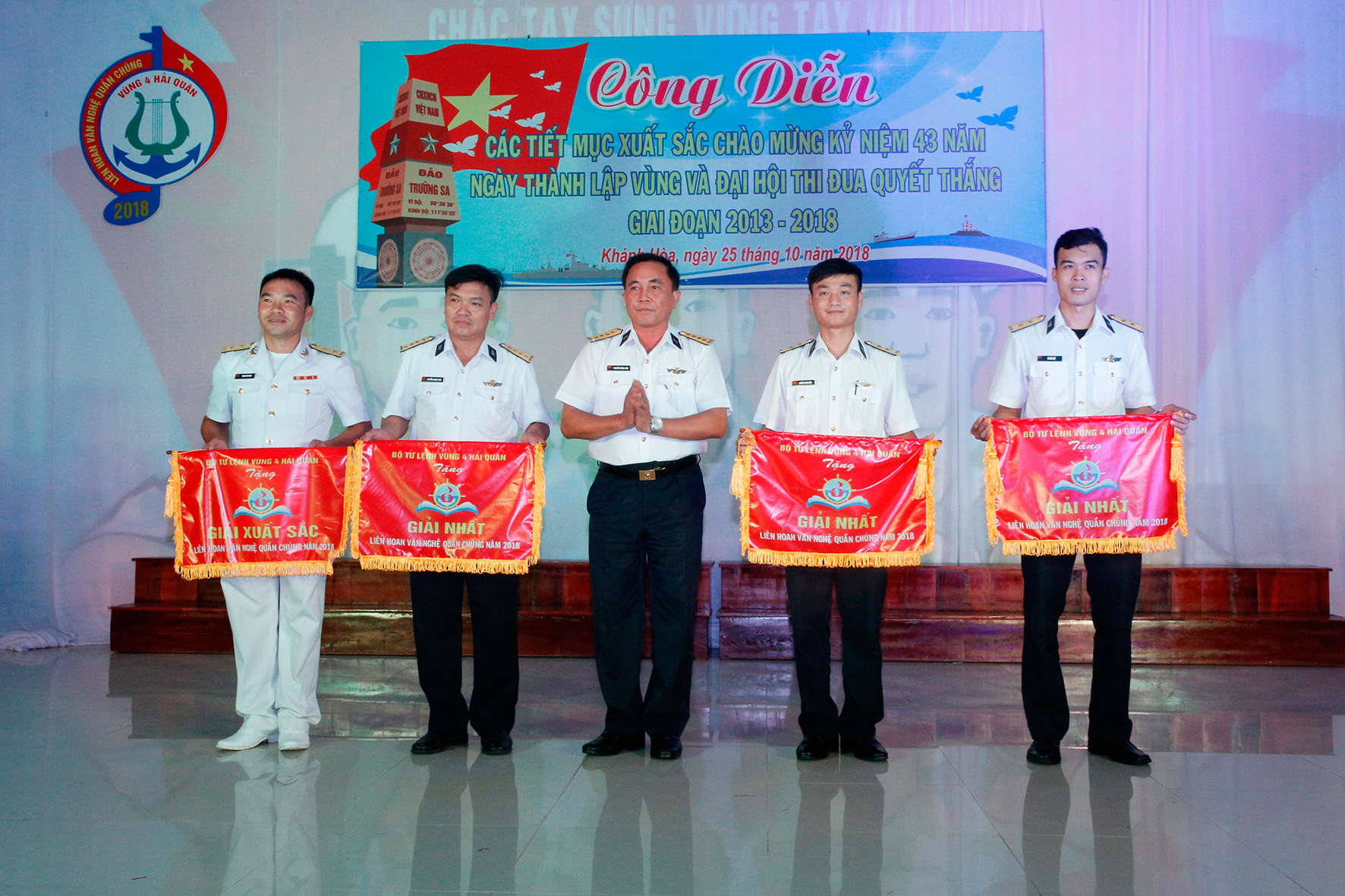 Tối 25-10, tại TP. Cam Ranh, tỉnh Khánh Hòa, Vùng 4 Hải quân đã công diễn các tiết mục văn nghệ xuất sắc và trao giải Liên hoan văn nghệ quần chúng năm 2018 nhân kỷ niệm 43 năm Ngày thành lập Vùng 4 Hải quân (26-10-1975 – 26-10-2018) và chào mừng Đại hội thi đua quyết thắng giai đoạn 2013-2018.