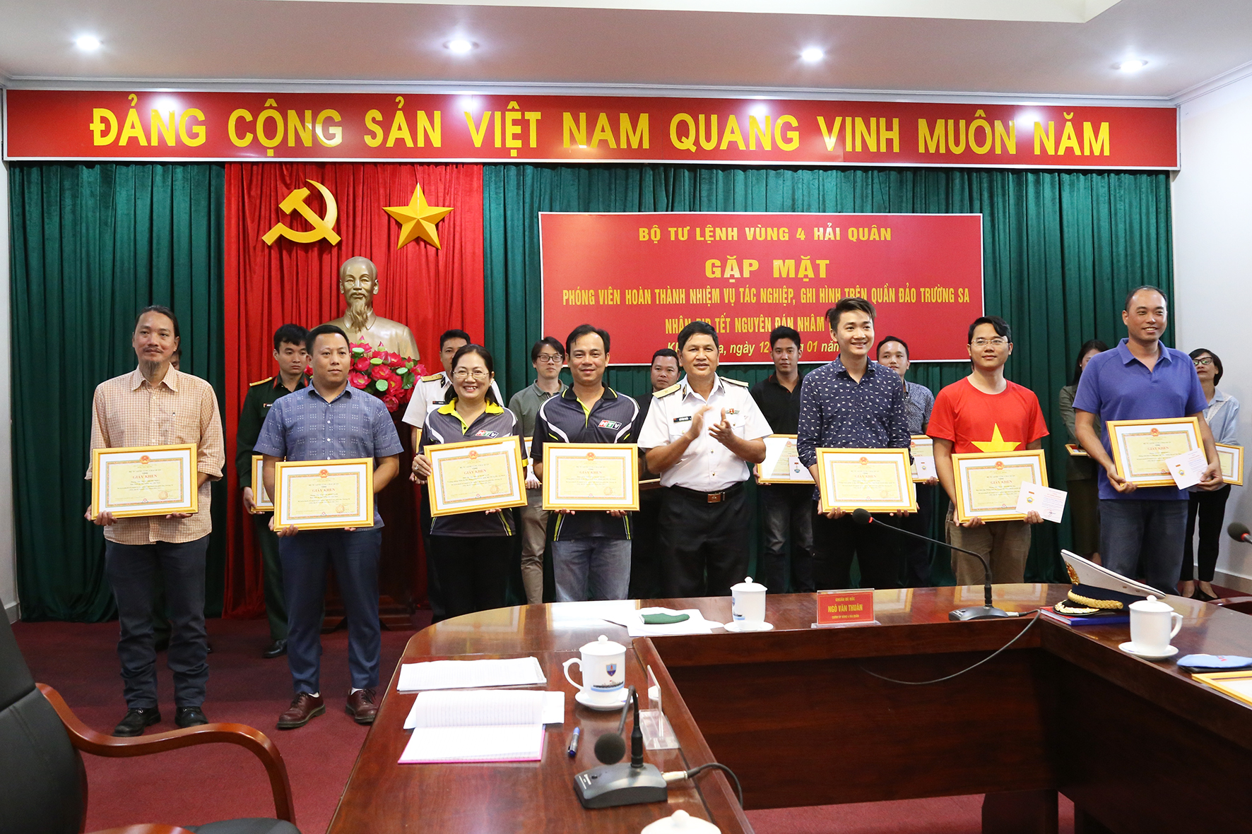 Dịp này, Bộ Tư lệnh Vùng 4 Hải quân đã gặp mặt và trao tặng Kỷ niệm chương vì sự nghiệp chủ quyền biển đảo, Huy hiệu chiến sĩ Trường Sa của Bộ Tư lệnh Hải quân và Giấy khen của Vùng cho các phóng viên đồng hành trong chuyến công tác.