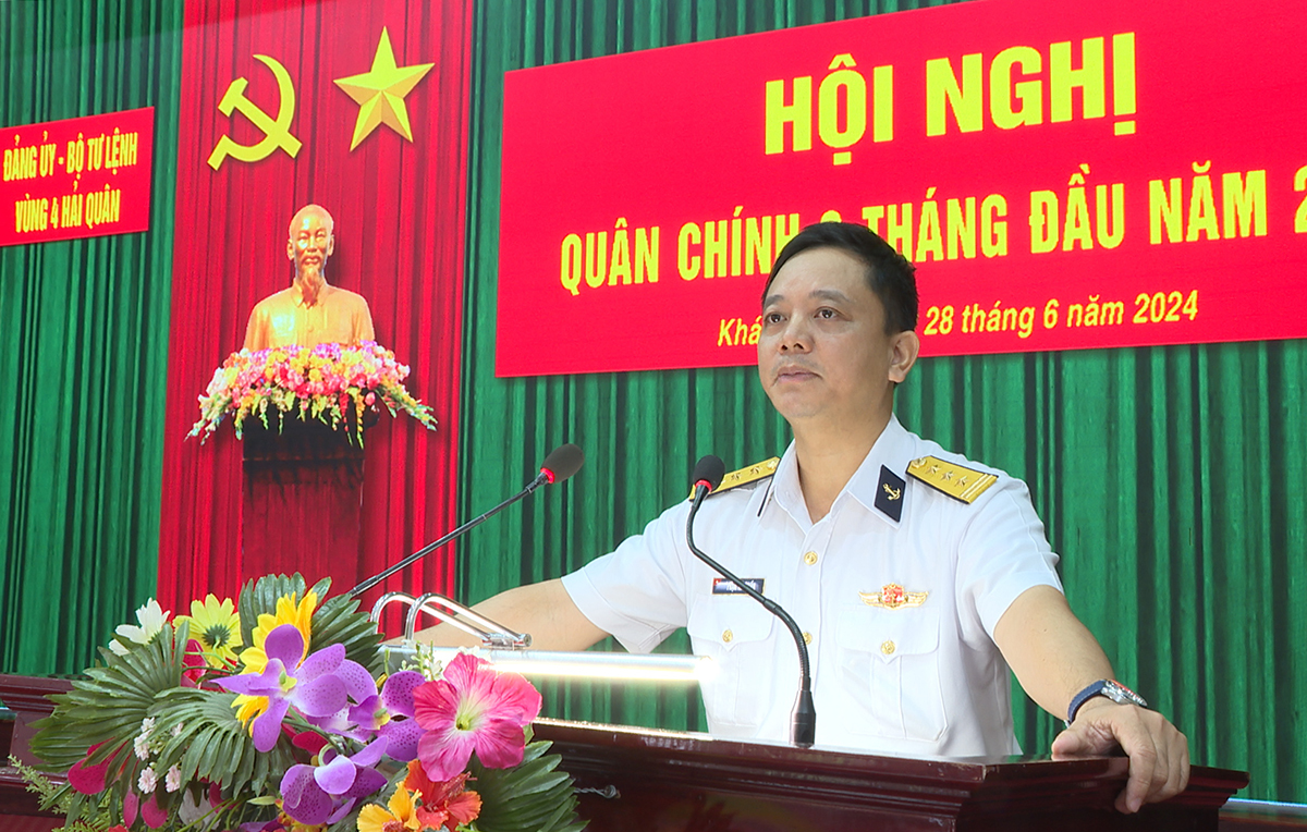 Sáng 28/6, tại TP. Cam Ranh, tỉnh Khánh Hòa, Bộ Tư lệnh Vùng 4 Hải quân tổ chức Hội nghị quân chính 6 tháng đầu năm 2024. Thượng tá Phạm Anh Tuấn, Phó Tư lệnh, Tham mưu trưởng Vùng chủ trì. Chuẩn Đô đốc Ngô Văn Thuân, Bí thư Đảng ủy, Chính ủy Vùng quán triệt Nghị quyết lãnh đạo thực hiện nhiệm vụ quân sự - quốc phòng 6 tháng cuối năm 2024.