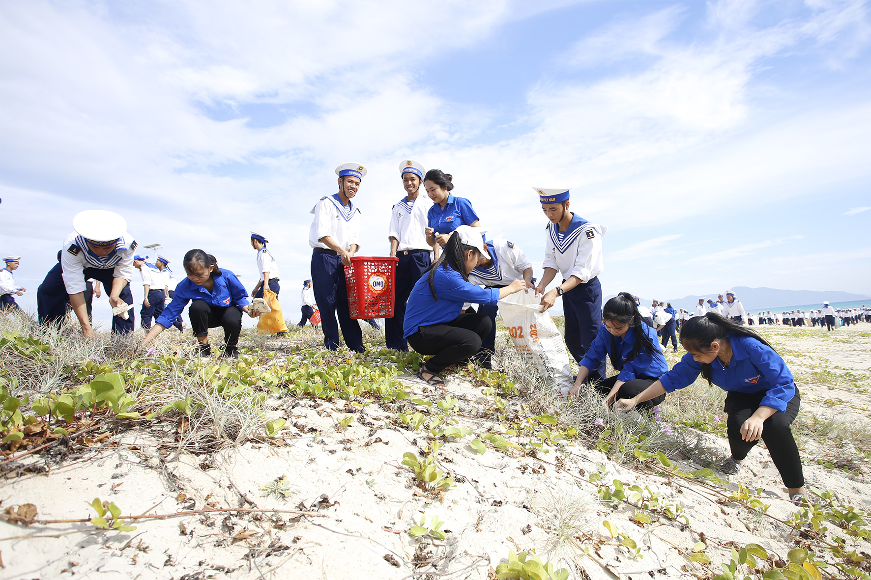 Đoàn viên, thanh niên Vùng 4 Hải quân và Thành đoàn Cam Ranh thu gom rác thải, làm sạch biển