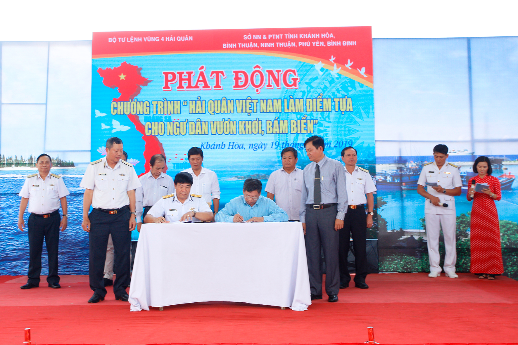 Tại buổi phát động, Đại tá Phan Tuấn Hùng, Tư lệnh Vùng 4 Hải quân đã cùng đại diện Sở Nông nghiệp và Phát triển nông thôn các tỉnh Khánh Hòa, Bình Định, Phú Yên, Ninh Thuận, Bình Thuận ký kết Kế hoạch phối hợp, triển khai thực hiện Chương trình “Hải quân Việt Nam làm điểm tựa cho ngư dân vươn khơi, bám biển”.