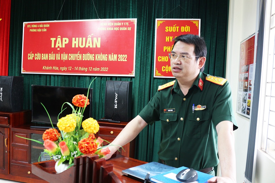 Sáng 12/12, tại TP. Cam Ranh, tỉnh Khánh Hoà, Bộ Tư lệnh Vùng 4 Hải quân phối hợp cùng Bệnh viện Quân y 175 và Học viện Quân y khai mạc lớp tập huấn cấp cứu ban đầu và vận chuyển đường không năm 2022. Thượng tá TS, BS Bùi Đức Thành, Phó Giám đốc Bệnh viện Quân y 175 dự và phát biểu khai mạc.