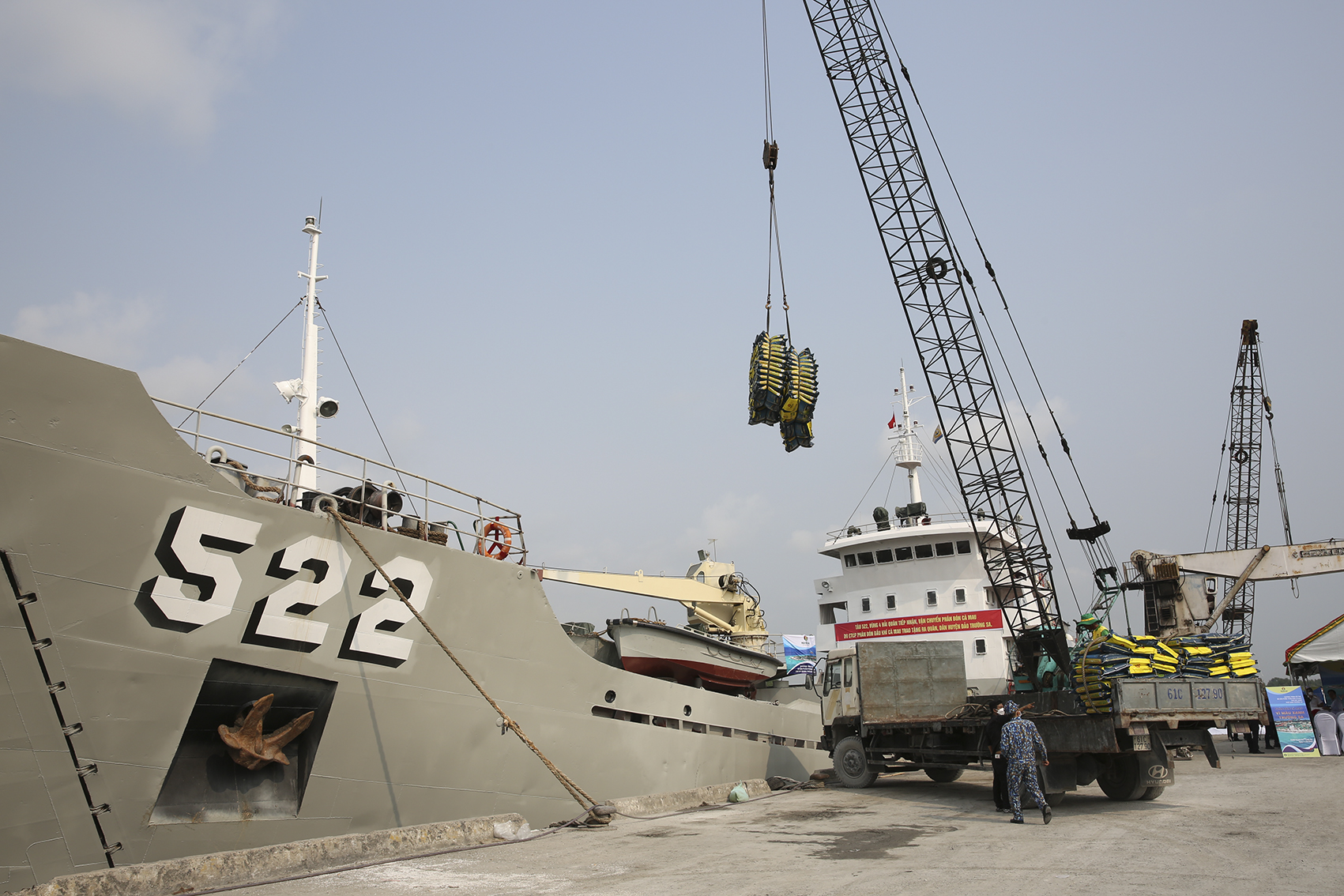 Phân bón được chuyển từ xe lên Tàu 522, Vùng 4 Hải quân