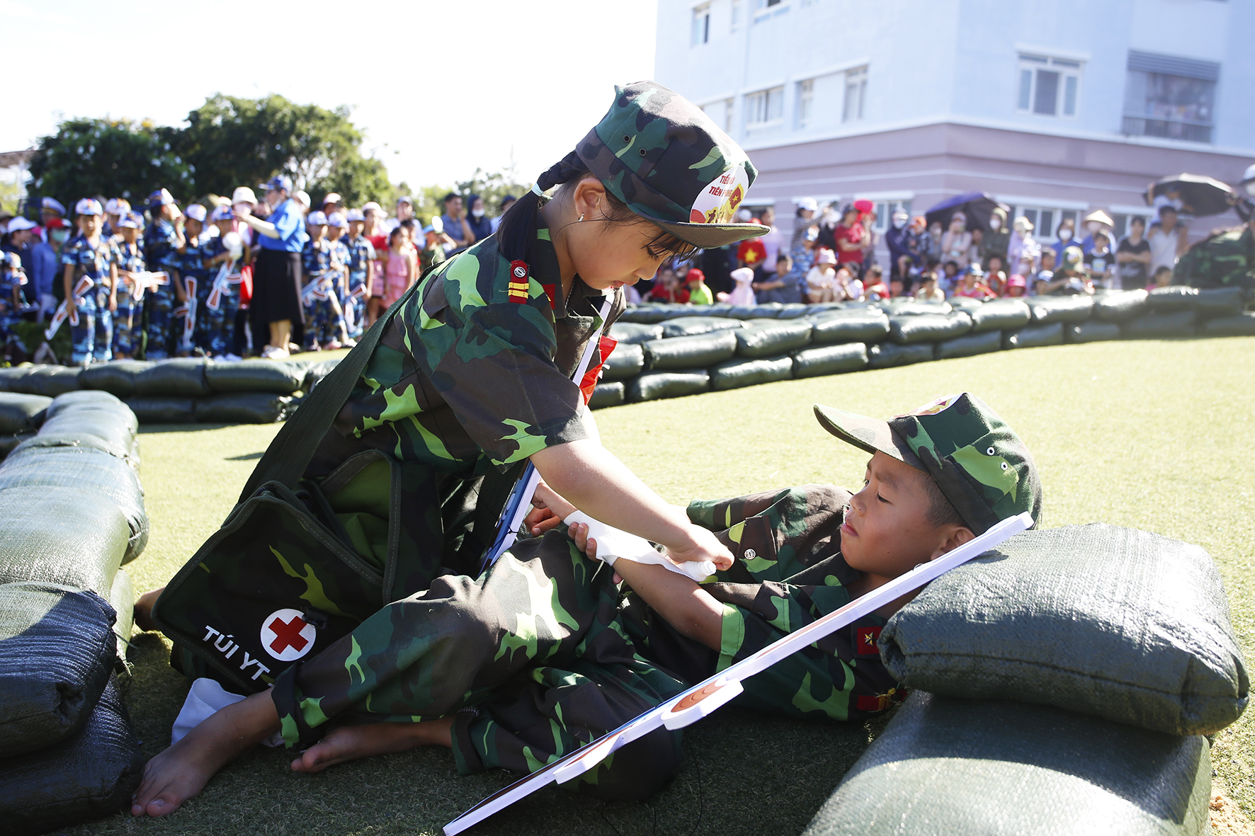 Tham gia “Em tập làm chiến sĩ”, các cháu thiếu nhi được trải nghiệm các hoạt động mô phỏng sát với thực tế môi trường quân ngũ như: huấn luyện điều lệnh đội ngũ, hành quân di chuyển, vượt chướng ngại vật, chiến đấu, cấp cứu chuyển thương…