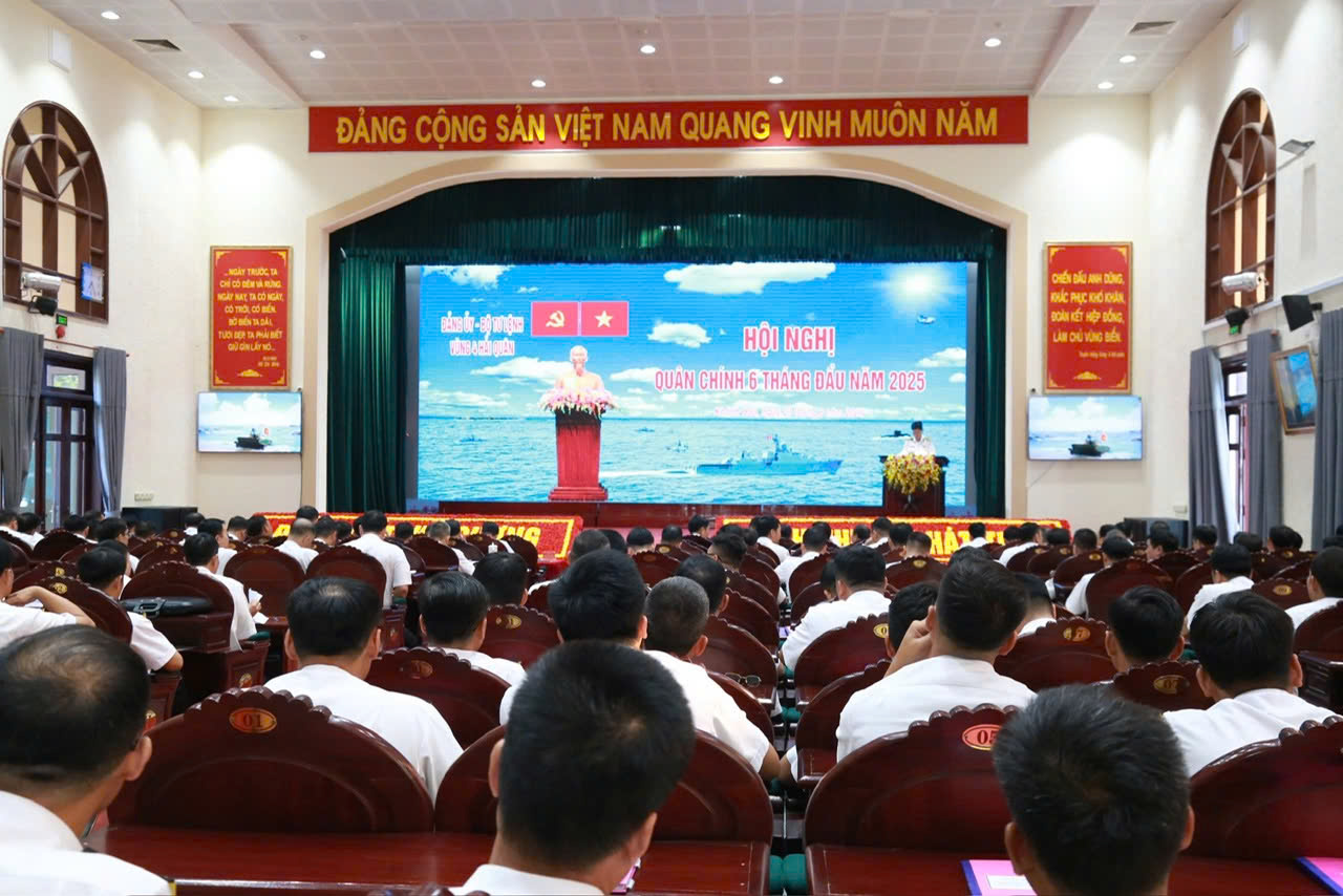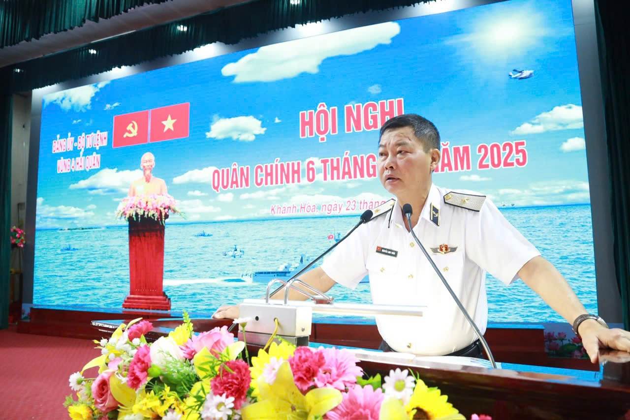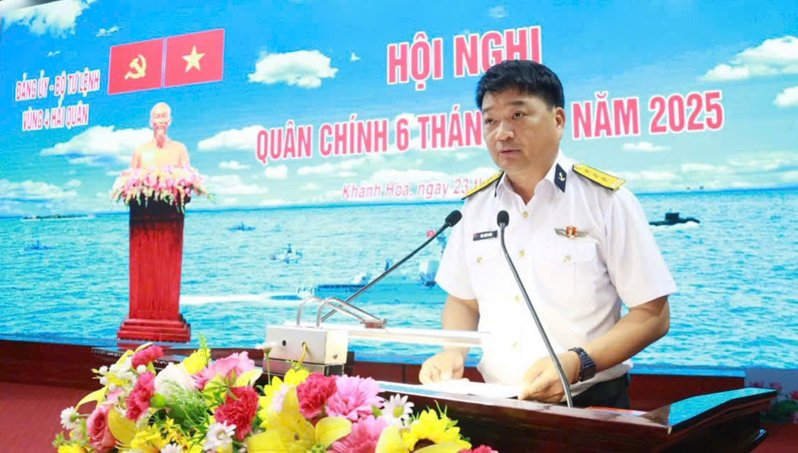 Sáng 23/6, tại TP. Cam Ranh, tỉnh Khánh Hòa, Đảng ủy, Bộ Tư lệnh Vùng 4 Hải quân tổ chức Hội nghị quân chính 6 tháng đầu năm 2025. Chuẩn Đô đốc Nguyễn Anh Tuấn, Tư lệnh Vùng chủ trì; Thượng tá Bùi Xuân Bình, Bí thư Đảng ủy, Chính ủy Vùng quán triệt nghị quyết lãnh đạo thực hiện nhiệm vụ 6 tháng cuối năm 2025 của Đảng ủy Vùng.