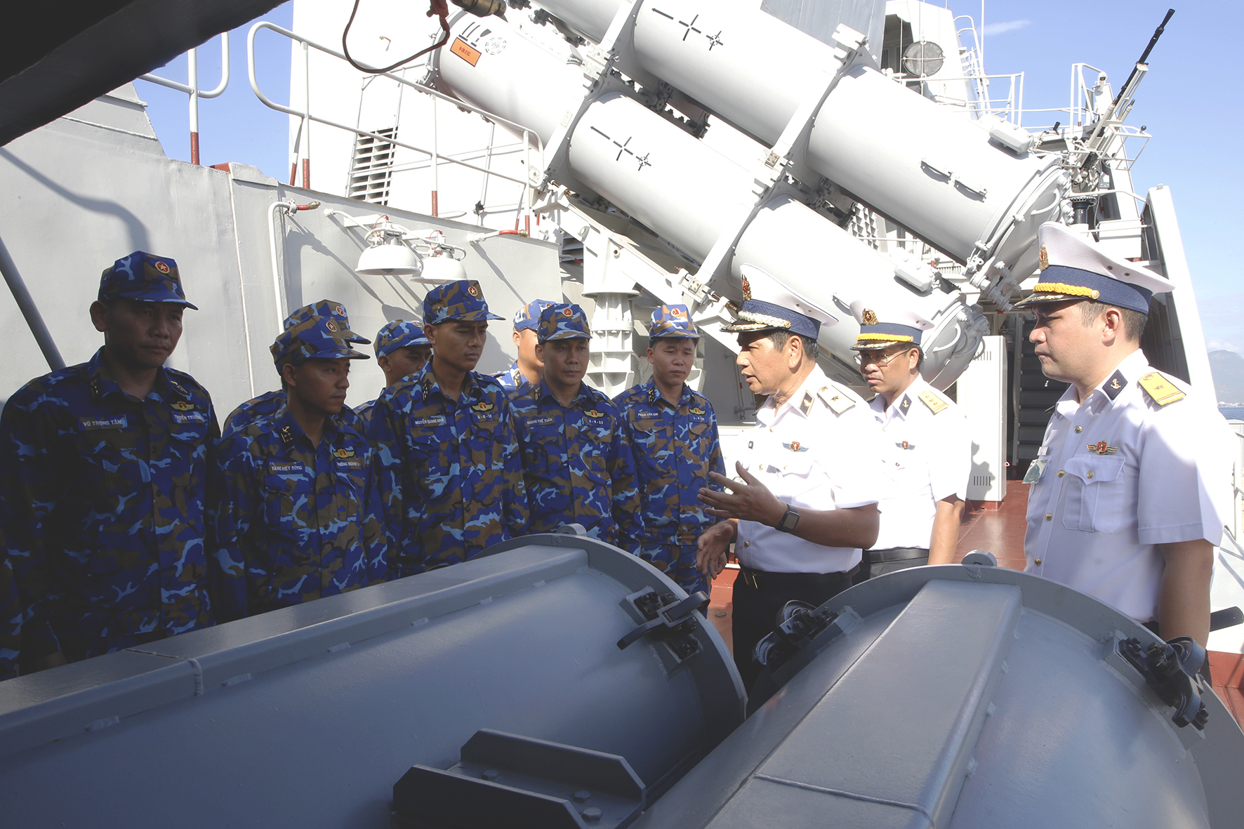 Chuẩn Đô đốc Ngô Văn Thuân trao đổi với cán bộ, thủy thủ Tàu 016-Quang Trung, Lữ đoàn 162 sau lễ khai mạc