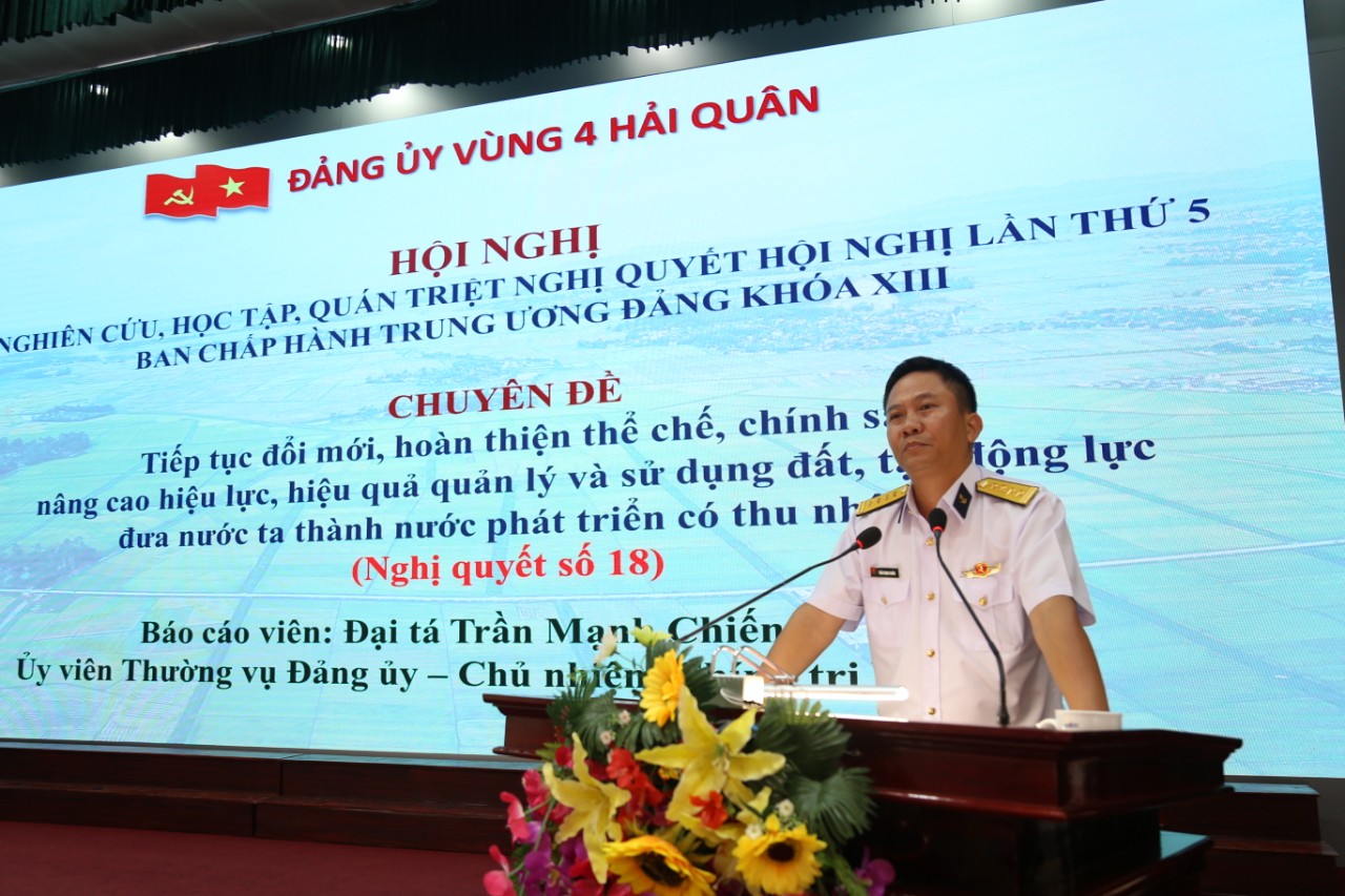 Ngày 10/8, tại TP. Cam Ranh, tỉnh Khánh Hòa, Đảng ủy Vùng 4 Hải quân tổ chức Hội nghị nghiên cứu, học tập, quán triệt, triển khai thực hiện Nghị quyết Hội nghị lần thứ 5, Ban Chấp hành Trung ương Đảng Khóa XIII và nhiệm vụ của Quân chủng, Vùng 6 tháng cuối năm 2022. Đại tá Trần Mạnh Chiến, Chủ nhiệm Chính trị Vùng chủ trì.