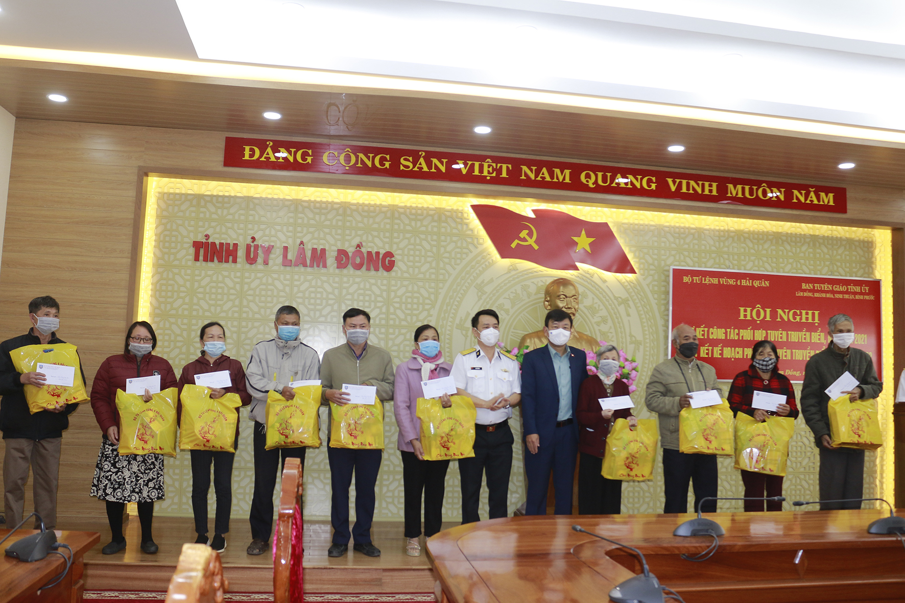 Dịp này, Bộ Tư lệnh Vùng 4 Hải quân đã trao tặng Giấy khen cho 8 cá nhân của các địa phương vì có thành tích tốt trong công tác phối hợp tuyên truyền biển, đảo năm 2021 và tặng 10 phần quà cho các gia đình chính sách ở TP. Đà Lạt và huyện Đức Trọng thuộc tỉnh Lâm Đồng.