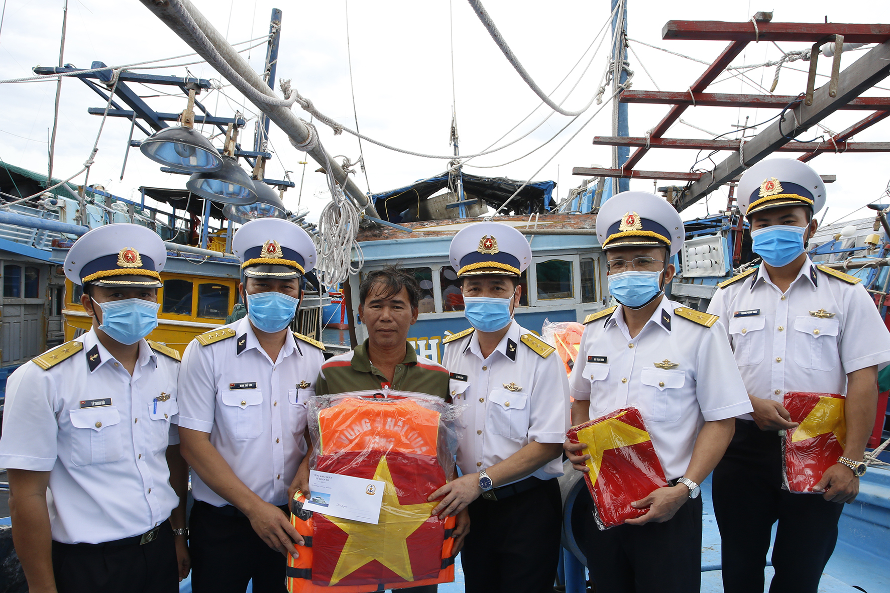 Thủ trưởng Vùng 4 tặng cờ Tổ quốc và áo phao cho các ngư dân tại cảng cá Cà Ná