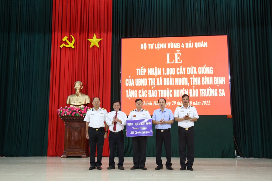 Ngày 29/10, tại TP. Cam Ranh, tỉnh Khánh Hoà, đoàn công tác do đồng chí Văn Thanh Gia, Chủ tịch Hội đồng nhân dân thị xã Hoài Nhơn, tỉnh Bình Định làm trường đoàn đã tiến hành trao tặng quân, dân huyện đảo Trường Sa, tỉnh Khánh Hòa 1.000 cây dừa giống.