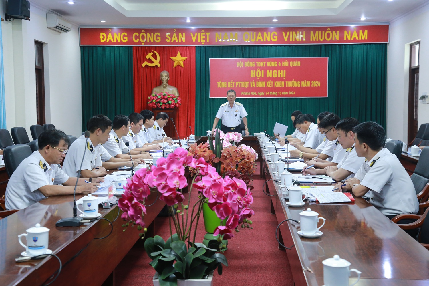 Chiều 24/10, tại TP. Cam Ranh, tỉnh Khánh Hoà, Hội đồng thi đua, khen thưởng (TĐKT) Vùng 4 Hải quân tổ chức Hội nghị tổng kết phong trào thi đua Quyết thắng (TĐQT) năm 2024. Chuẩn Đô đốc Nguyễn Anh Tuấn, Phó Chủ tịch Hội đồng TĐKT, Tư lệnh Vùng chủ trì.