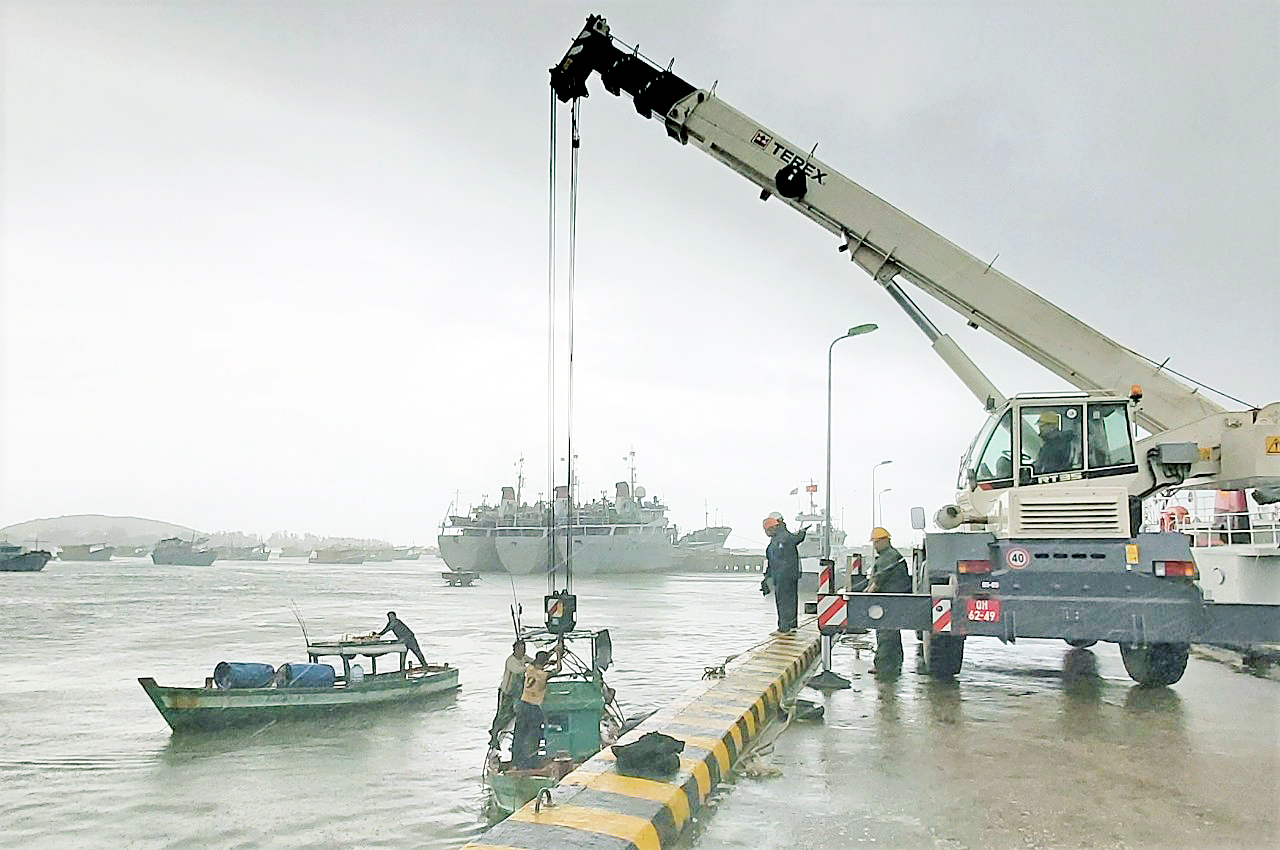 Ngày 19-9, chủ tàu đã liên hệ đề nghị Vùng 5 giúp đỡ đưa tàu cá lên bờ để sửa chữa. Nhận được thông tin, đơn vị đã điều 2 xe cẩu cùng 10 cán bộ, chiến sĩ Xưởng 58, Phòng Kỹ thuật Vùng đến hiện trường.